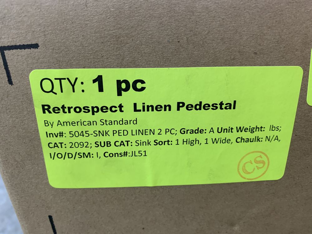 Retrospect Linen Pedestal. By American Standard, Grade: A,This is a liquidated product. Any pre-existing retail, wholesale or manufacturer warranties will not transfer with the sale of this Product unless expressly stated otherwise. Weight: x. Sold by: Piece . Sold as: Quantity X Price. Inventory #: 5045-SNK PED LINEN 2 PC
