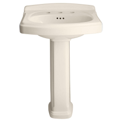 Portsmouth 2 Piece Linen Pedestal Sink. 8" Center Drain, By American Standard, 3 Hole Faucet Installation, Grade: A,This is a liquidated product. Any pre-existing retail, wholesale or manufacturer warranties will not transfer with the sale of this Product unless expressly stated otherwise. Weight: x. Sold by: Piece. Sold as: Quantity X Price. Inventory #: 5045-SNK PED LINEN 2 PC