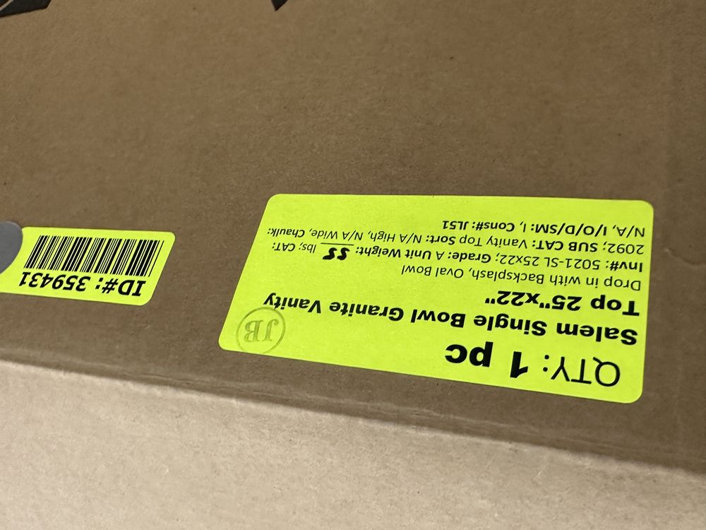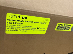 Salem Single Bowl Granite Vanity Top 25"x22". Drop in with Backsplash, Oval Bowl. Grade: A This is a liquidated product. Any pre-existing retail, wholesale or manufacturer warranties will not transfer with the sale of this Product unless expressly stated otherwise. Weight: 55. Sold by: Piece. Sold as: Quantity X Price. Inventory #: 5021-SL 25x22