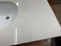 White Sands Single Bowl Granite Vanity Top 37"x22". Drop in with Backsplash, Oval Bowl, Grade: A.,This is a liquidated product. Any pre-existing retail, wholesale or manufacturer warranties will not transfer with the sale of this Product unless expressly stated otherwise. Weight: 100. Sold by: Piece. Sold as: Quantity X Price. Inventory #: 5021-WHS 37x22