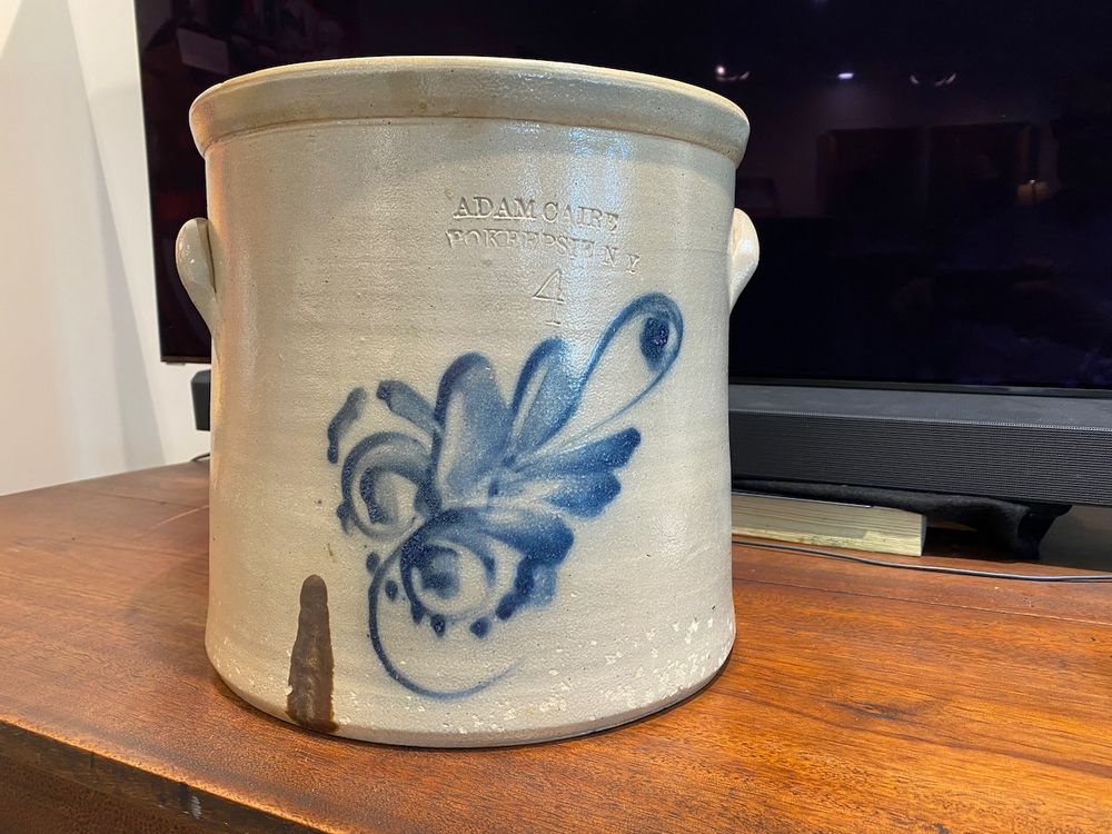 C-1850 Adam Caire Poughkeepsie, NY #4 Blue Decorated Crock, Double-Handled, From the Private Collection of Judge James Brands, Pickup Only, Rhinebeck, NY