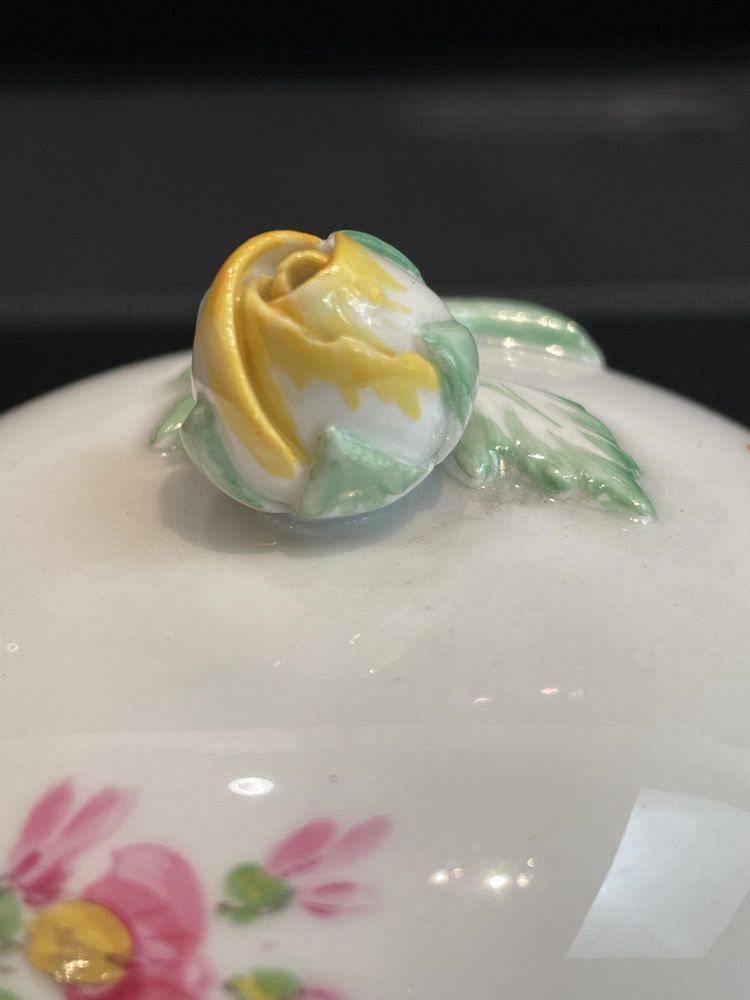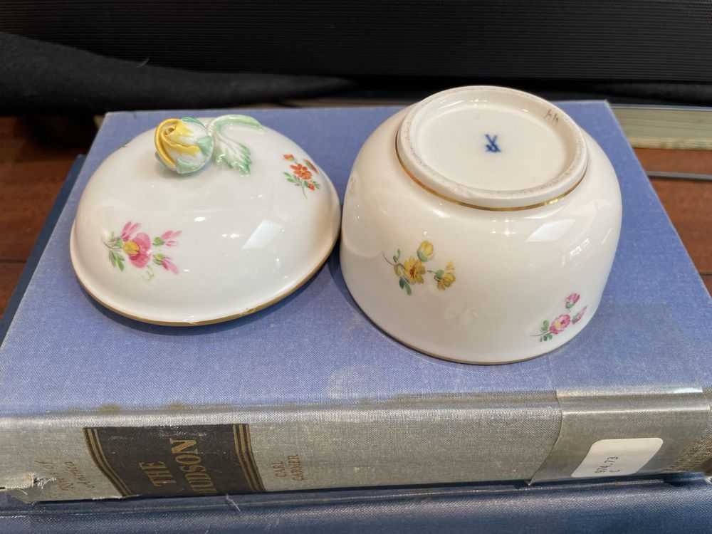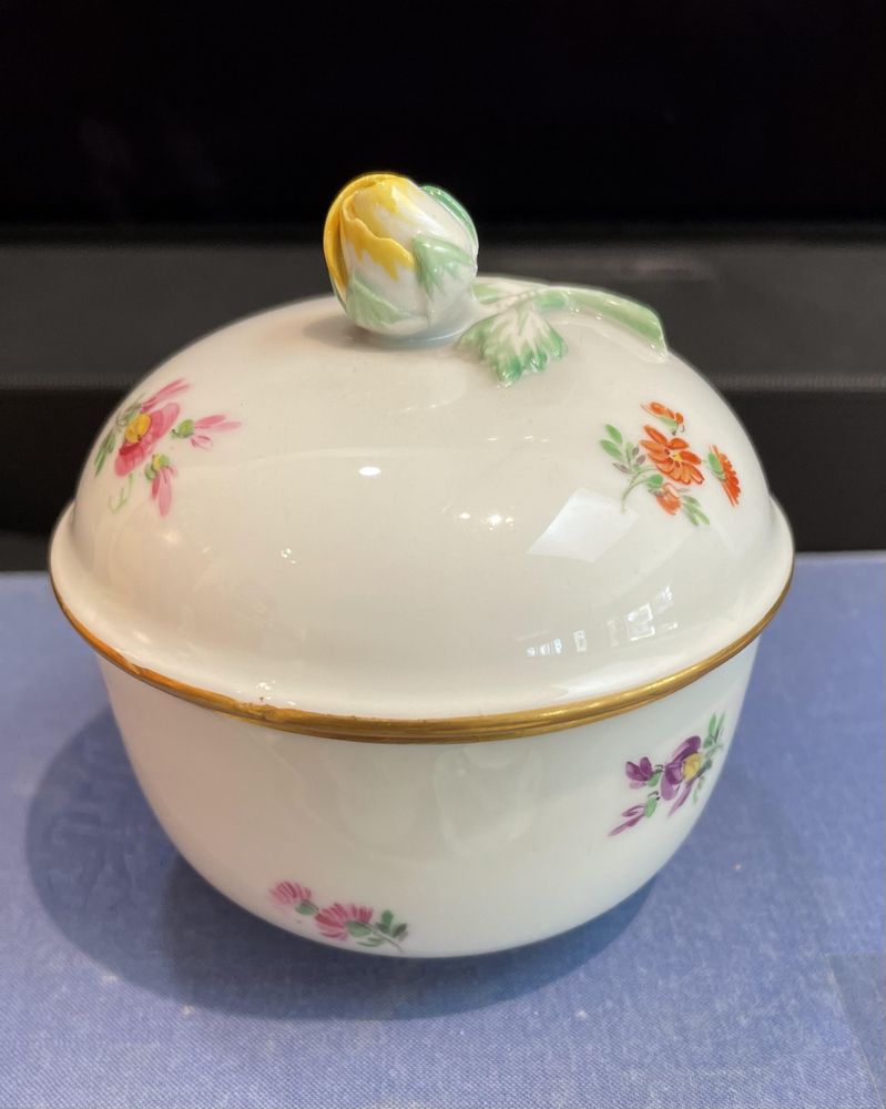 Meissen Covered Sugar Bowl with Flower Finial. Marked on bottom with blue crossed swords. Measures 3.5" tall & 3.5" wide. Tiny flea bites to flower finial.