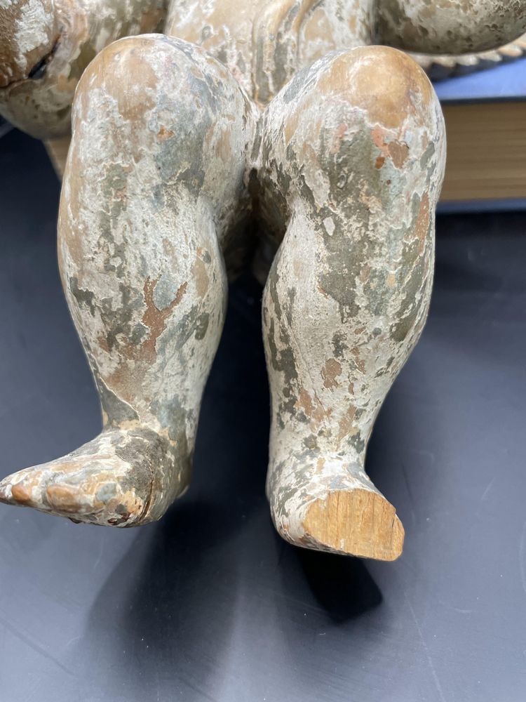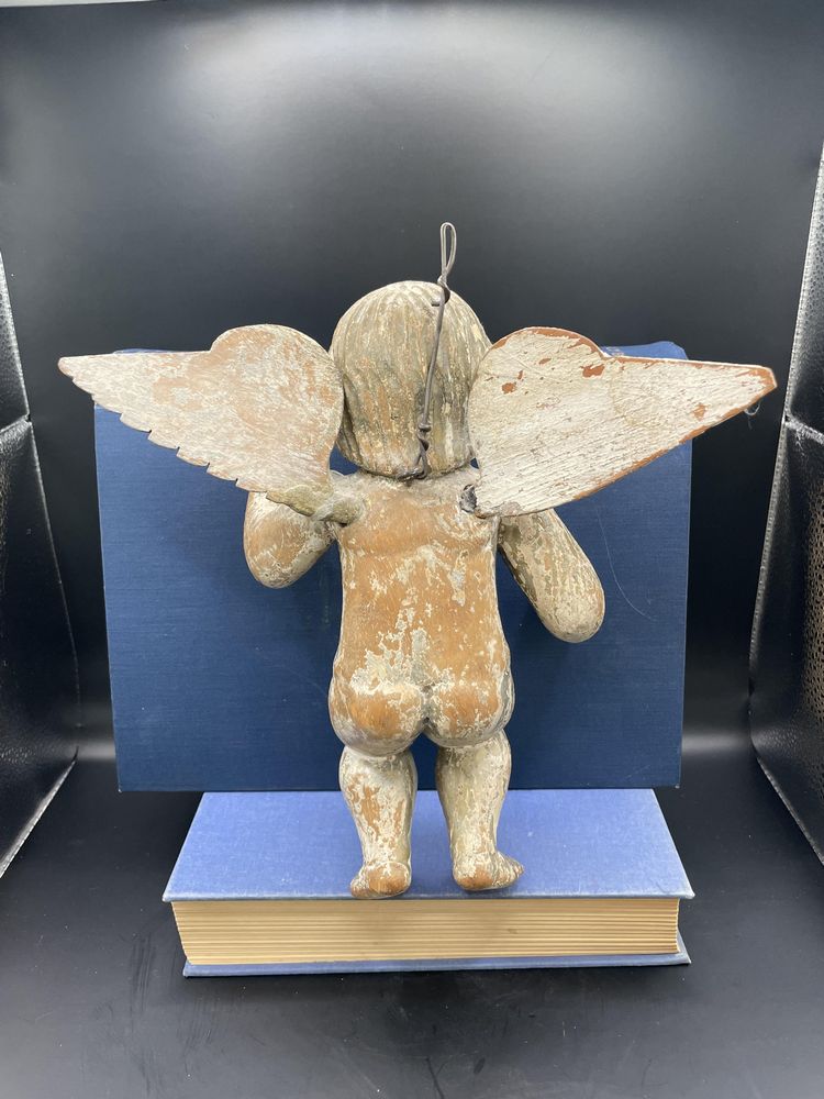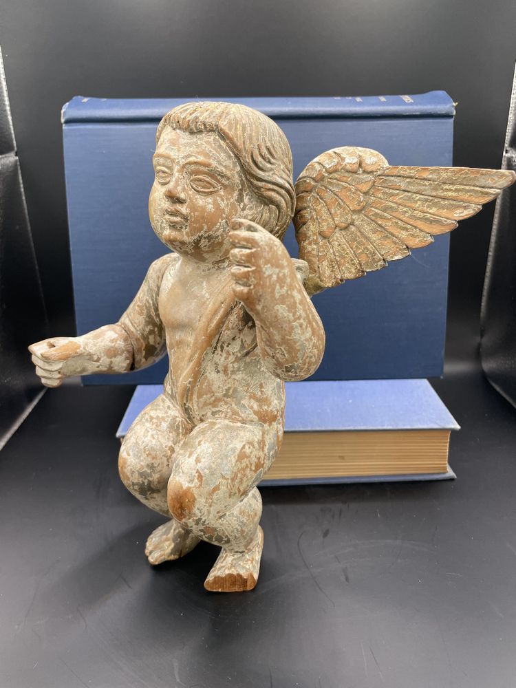 Antique European Hand Carved Wood Angel Statue. Most likely Spanish or Italian. Measures 9" tall, 9" wide, and 4" long. Chip to angel's left foot resulting in missing toes. Left wing is a more modern replacement.