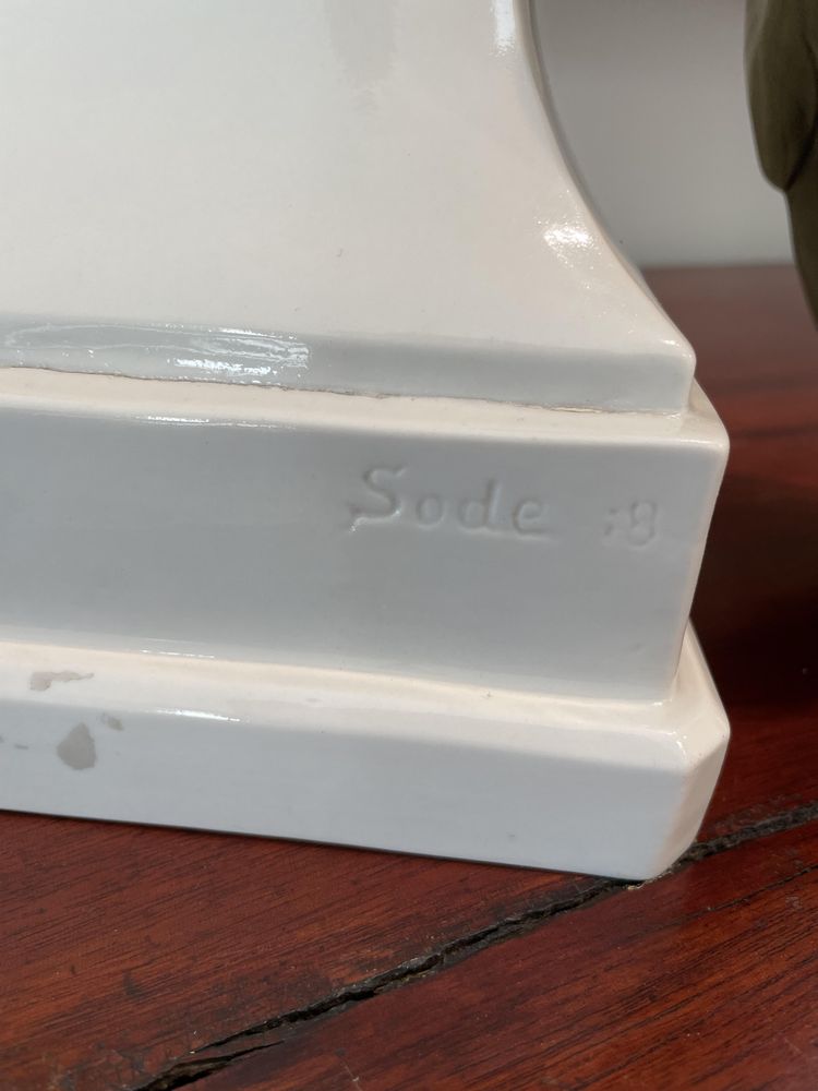 Large porcelain statue titled "Peacock on High Pedestal" signed by artist Edmund Sode. Dated 1918. Manufactured by Schwarzburger Werkstätten, Unterweissbach. Measures 26" Tall, 12" Long and 6.5" wide. The peacock's left foot is broken off with evidence of a previous repair. Broken foot is included.