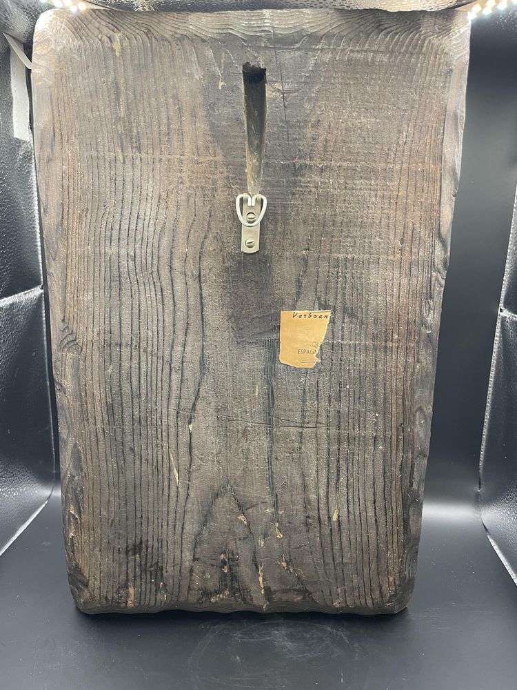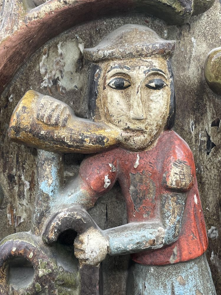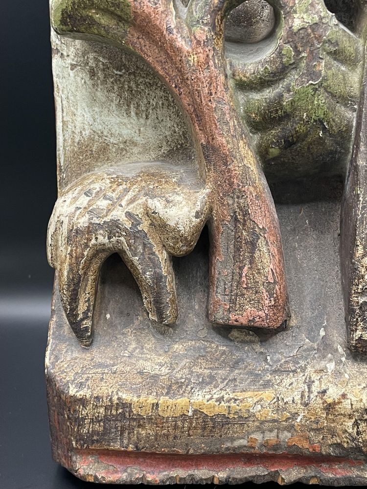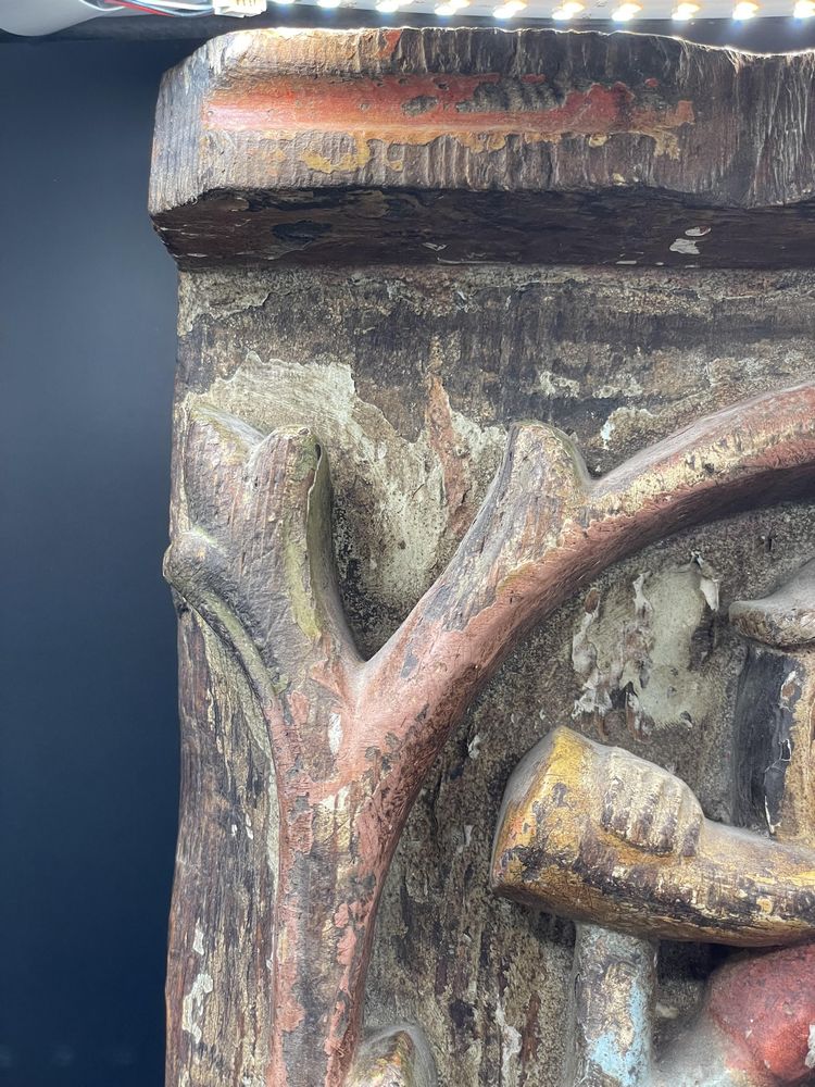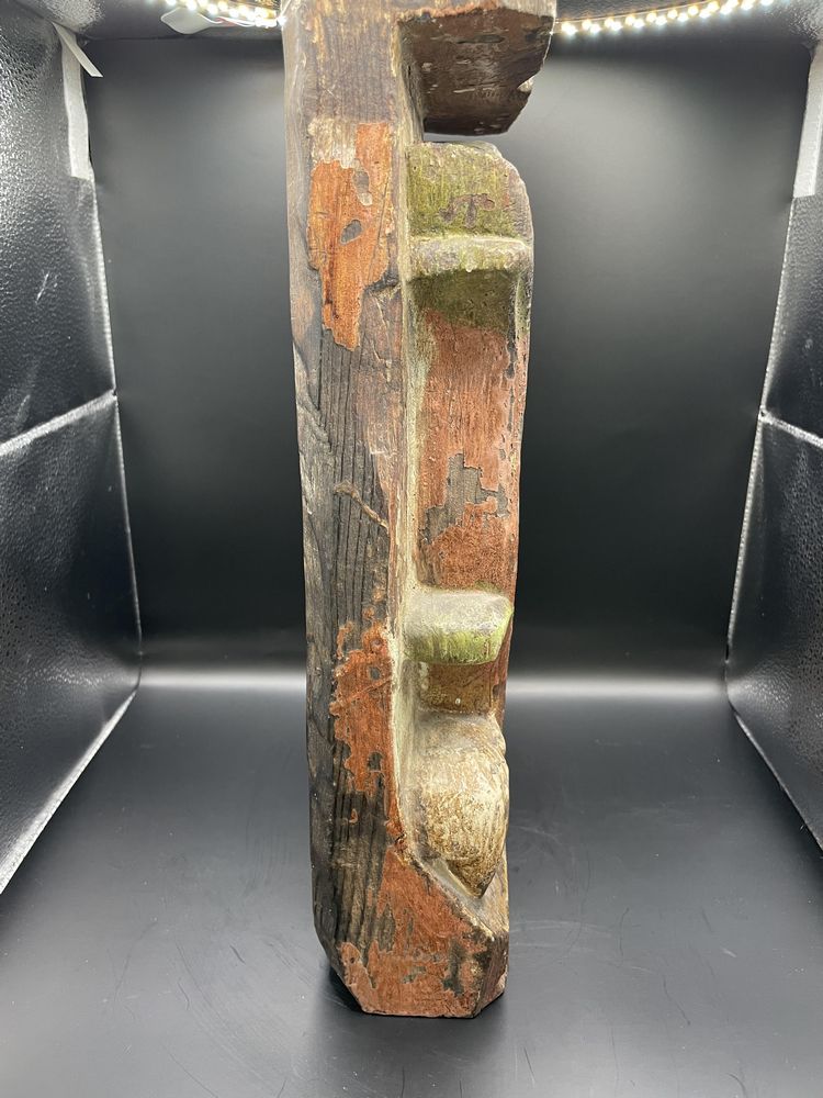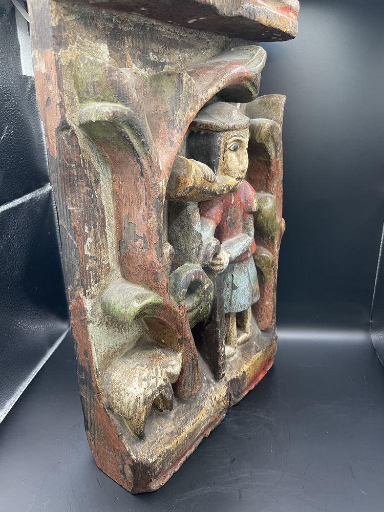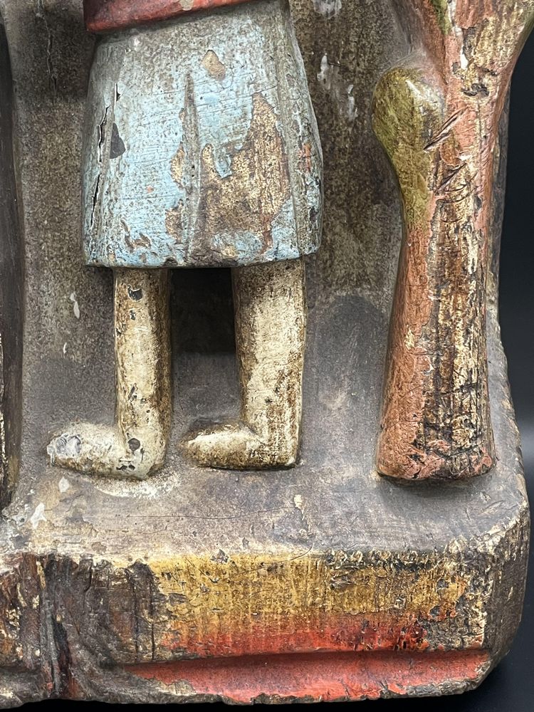 Antique Spanish Colonial Carved Wood Architectural Panel of a Shepherd with Crook. Measures 14.5" tall, 9" wide and 3" deep. Paint loss and surface wear across the panel.