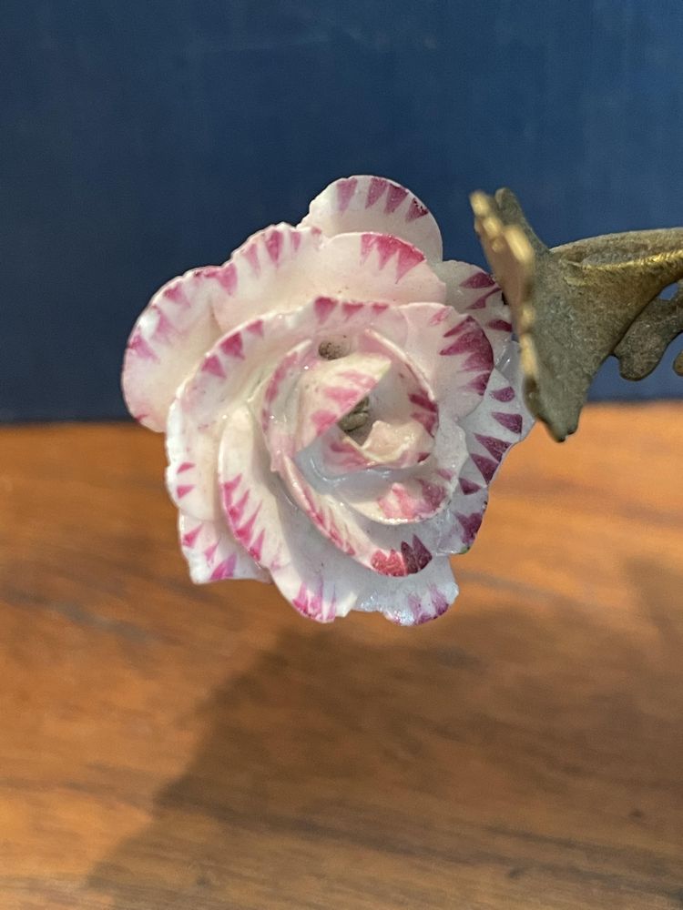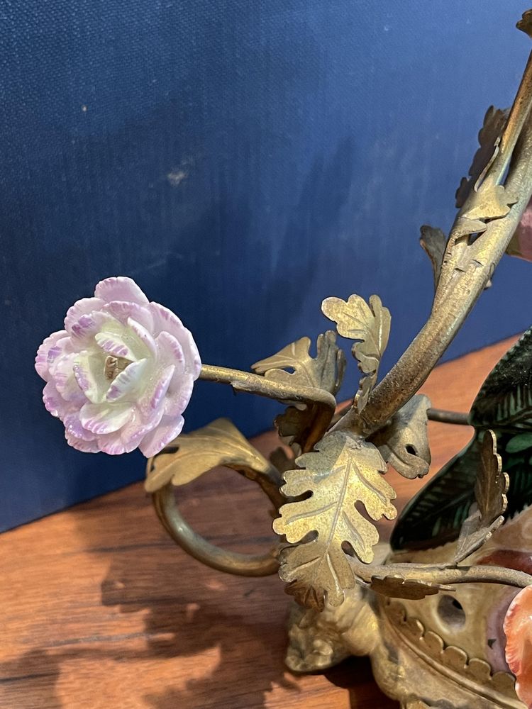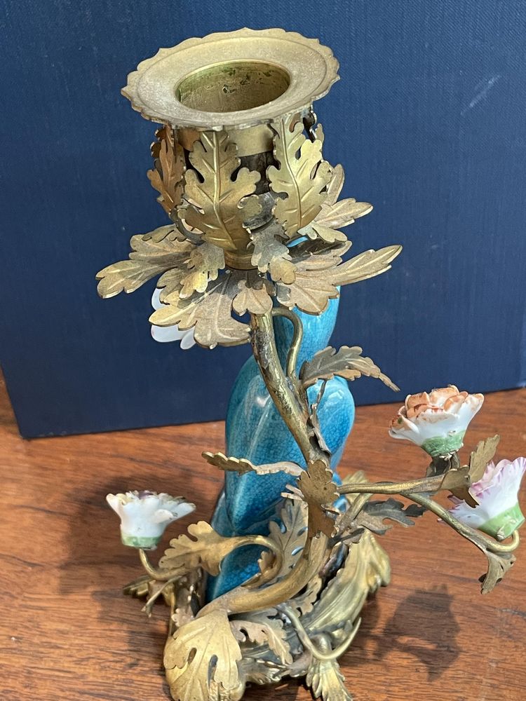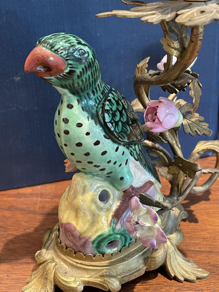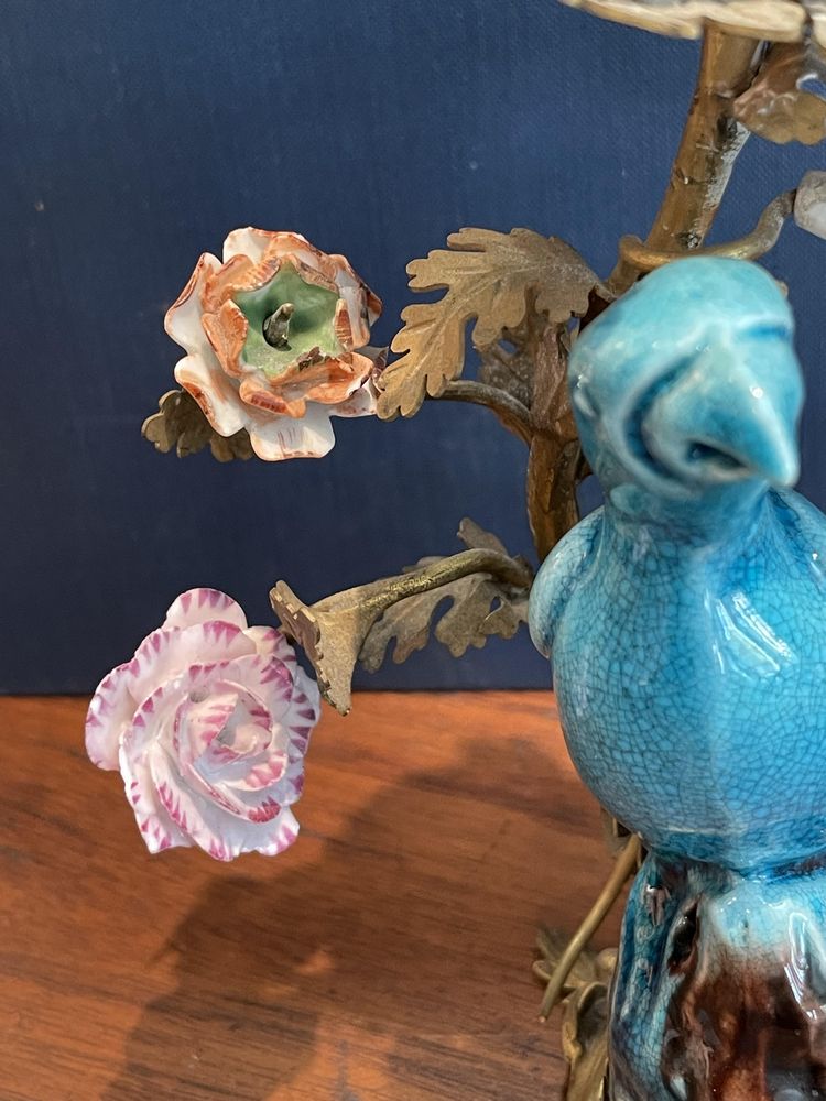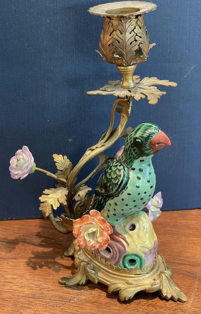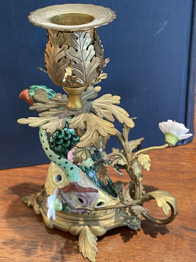 Pair of antique metal candlesticks with porcelain birds and flowers. Each measures 7" tall, 5" long and 4" wide. Minor flea bites to edges of porcelain flowers.