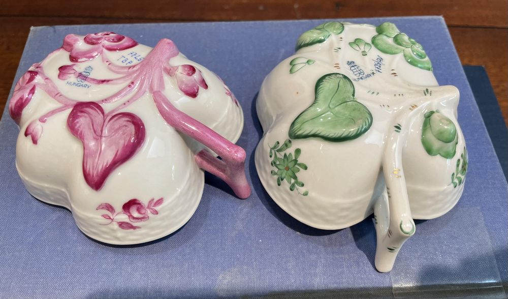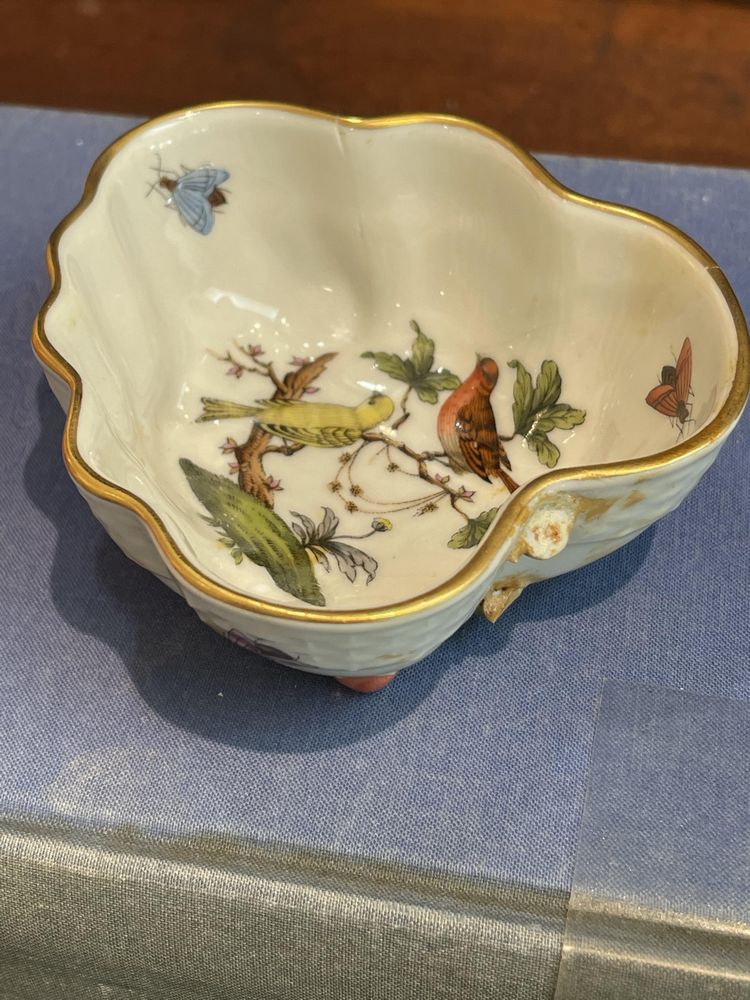 Three Herend Hungary Porcelain Leaf Dishes & Heart Shaped Box. Each piece is hand painted with a gilt gold rim. Each leaf dish is 4" long, 3" wide and 1.5" tall. Bottom is marked with the Herend Hungary stamp on the bottom. Pink and Green leaf dishes are in excellent condition. The Rothchild Bird pattern leaf dish has the handle broken and missing. Also, multiple visable cracks from old repair.