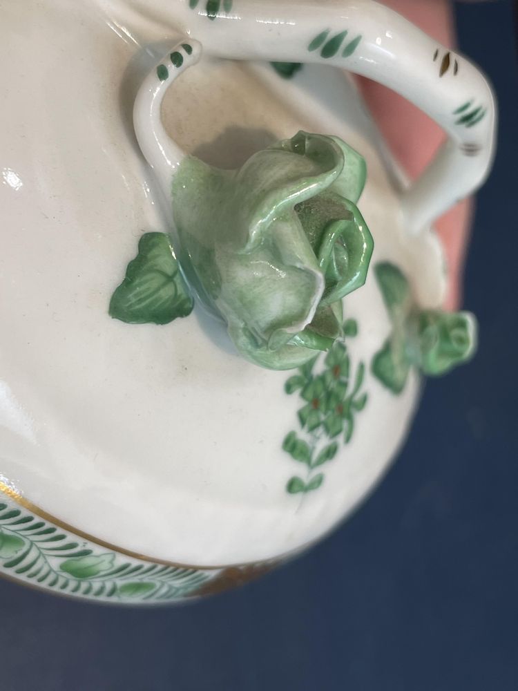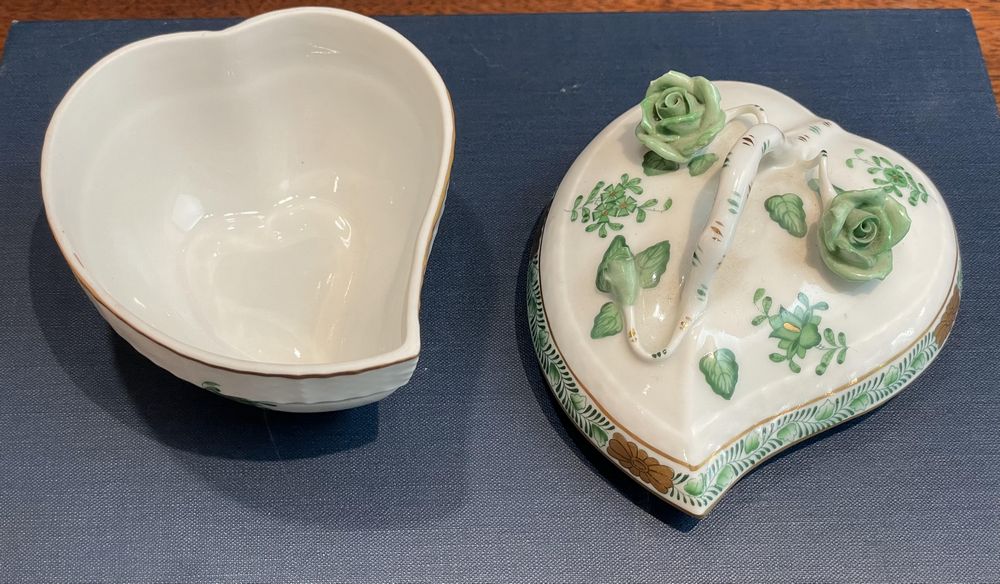 Herend Green Chinese Bouquet Heart Shaped Box. Measures 5" long, 4" wide, 4" tall. Bottom is marked with the Herend Hungary stamp on the bottom. Excellent Condition.