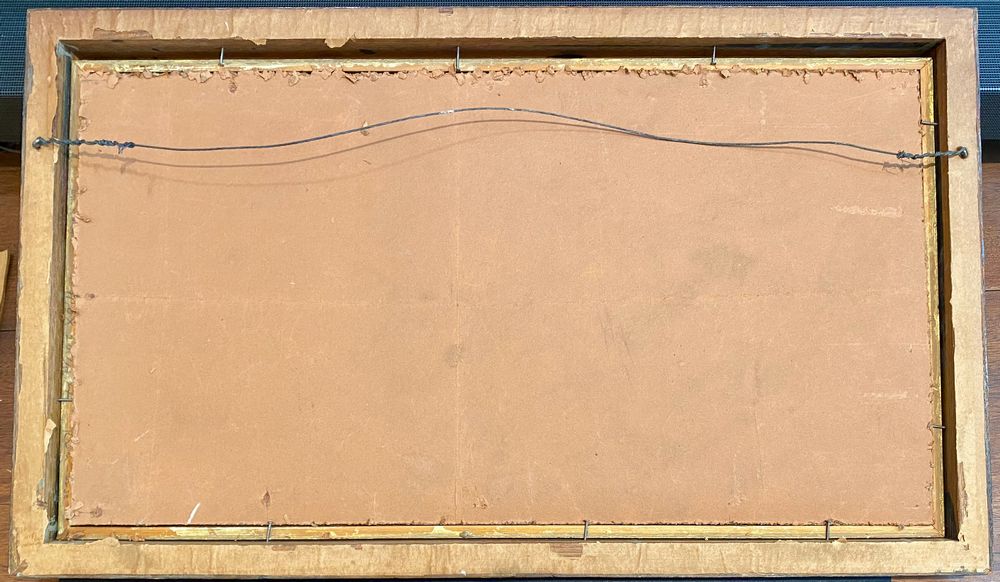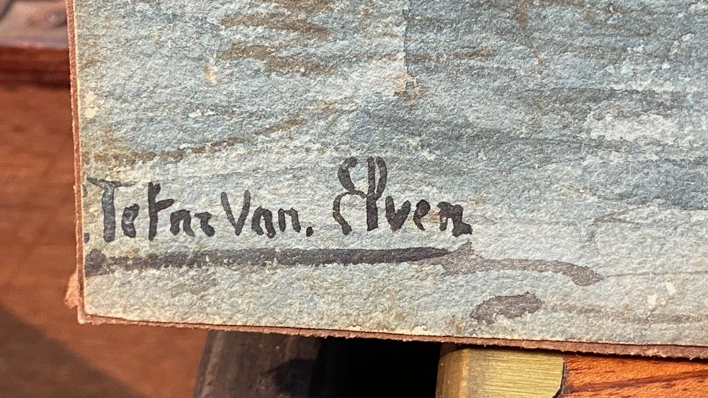 Behind glass, signed Tetar Van Elven. Peter Henricus Theodorus (Pierre) Tetar Elven (born 30 August 1828 - died 1 May 1908) was a Dutch painter, draftsman, etcher, watercolorist and panorama painter of the 19th century. He had a preference for architecture, landscapes, and Italian cityscapes. Dimensions to outer edges of frame: 23" wide x 14" tall. Painted board: 20 3/4" wide x 11 1/4" tall.