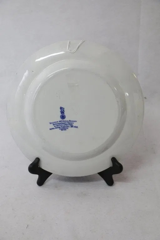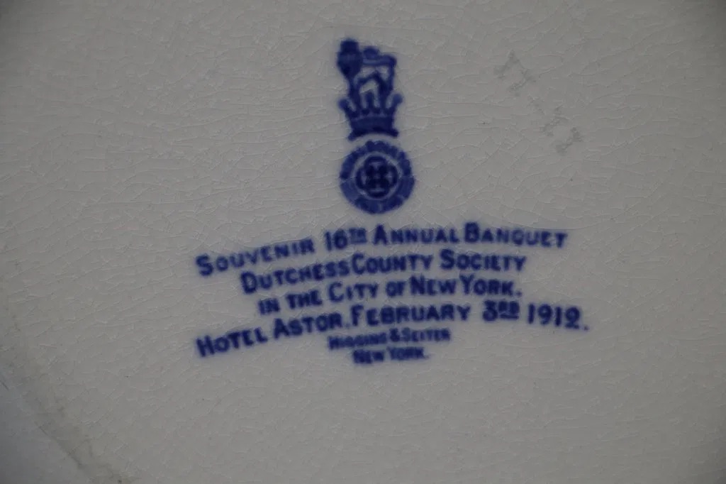 1912 Dutchess County Historical Royal Doulton Dutch Reformed Church, Fishkill, NY. This 10.5" diameter plate with "The Old Dutch Church at Fishkill Village" has Royal Doulton backstamp: “Souvenir 12th Annual Banquet / Dutchess County Society." A beautiful blue and white souvenir plate given to attendees of the January 15, 1912 meeting of the Dutchess County Society, hosted at the Astor Hotel in New York City. A rare survivor of Dutchess County, N.Y. history.