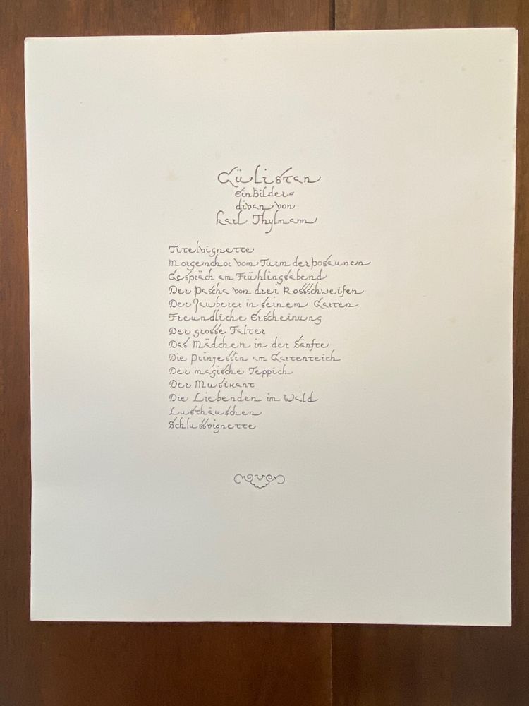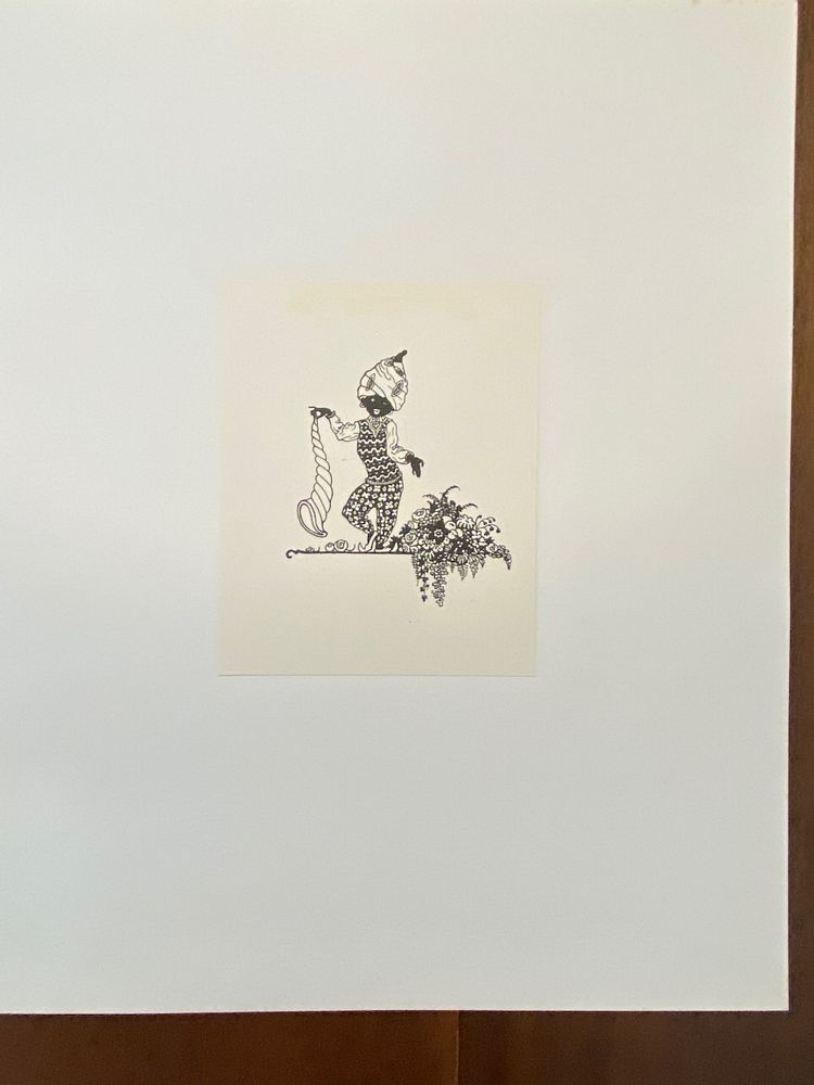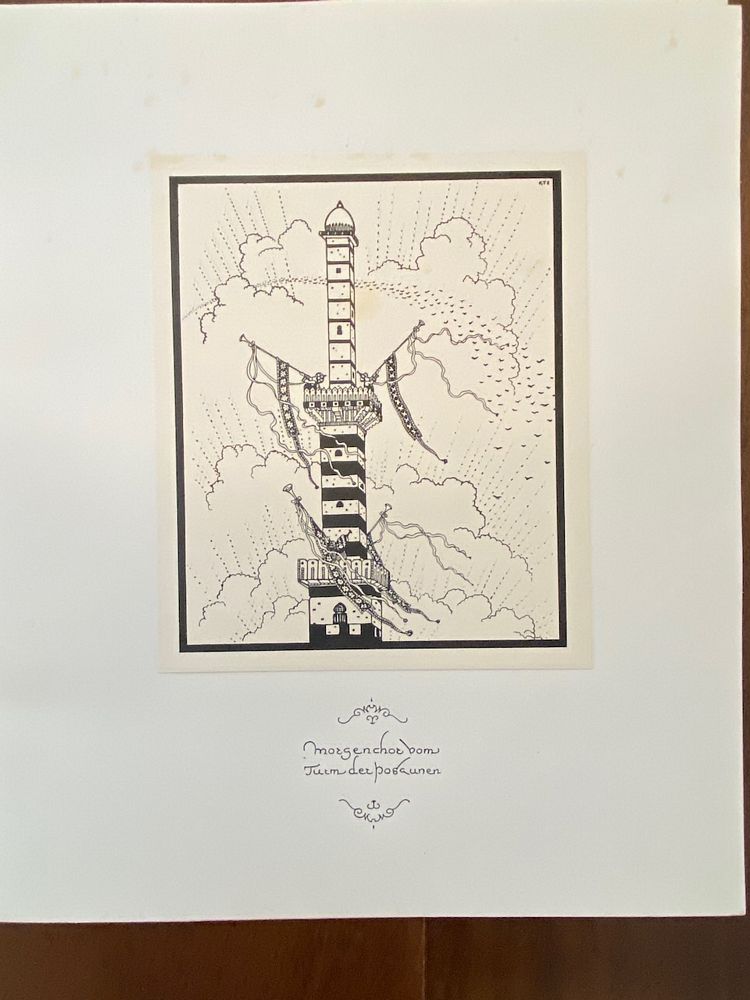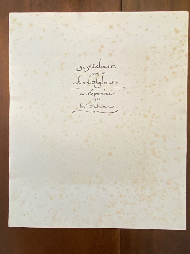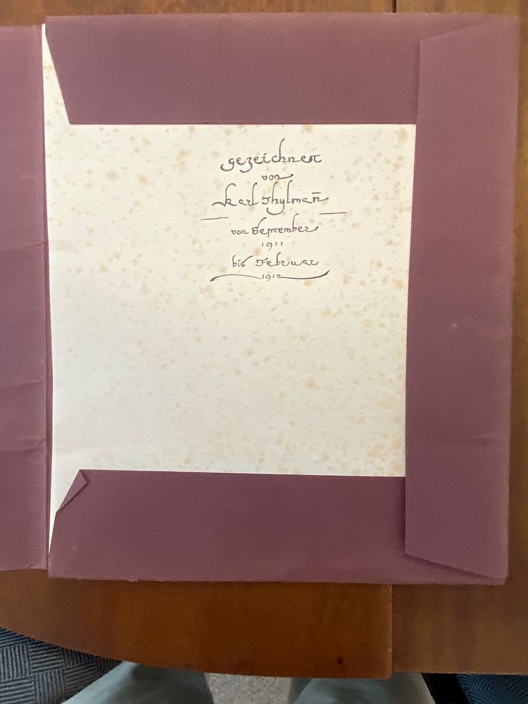 This folio, by German artist Karl Thylmann, was a modern interpretation of the ancient poetry. With 14 pages of intricately detailed illustrations, the folio mixes the styles of Persia, modern day Iran, and the artistic movements of Europe in the early 20th century. There are a total of 16 pages, 14 of which are illustrations. The pages measure 13" wide x 15 3/4" tall. Folding case measures 13 1/2" wide x 16 1/4" tall. Cover has multiple light creases and soiling. Title page has foxing throughout with interior pages having minor foxing spots.