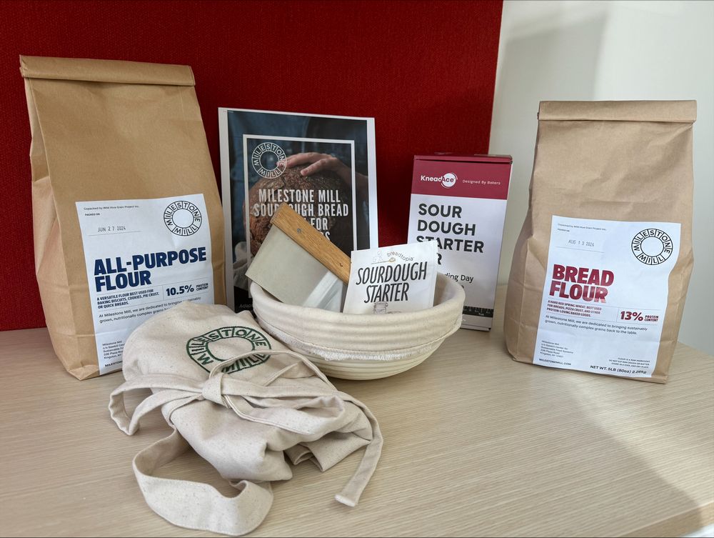 Milestone Mill’s products help to connect food processing locally grown grains with bakers and eaters in the Hudson Valley. Their sourdough bakers box contains everything you need to start baking delicious sourdough bread! Includes: Milestone Mill Bread flour, 5 lb bag; Milestone Mill All-Purpose flour, 5 lb bag; Proofing basket + basket liner; Dough scraper; Sourdough starter jar with spatula; Dry sourdough starter package; Milestone Mill embroidered apron; Sourdough recipe card.