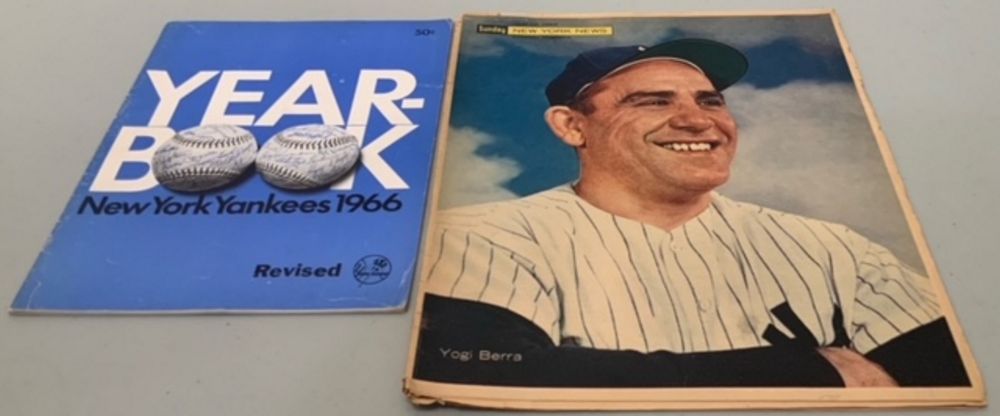 Two rare colorful, illustrated New York Yankee ephemera collectibles. The 1966 Yankees Yearbook is complete and in excellent condition. It has 48 black & white illustrated pages plus cover. This Official Program is chock full of photos, stats, profiles and articles. Every player is featured. 8.5"x11". The April 12, 1964 color portrait of NY Yankee Yogi Berra is on the cover of the Sunday New York News. The large, 13.5"x11", twenty-seven page insert is full of articles, photos and vintage ads. It is in very good condition for its age. Back cover is a full color advertisement for "Scott" paper products.