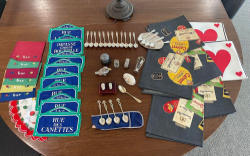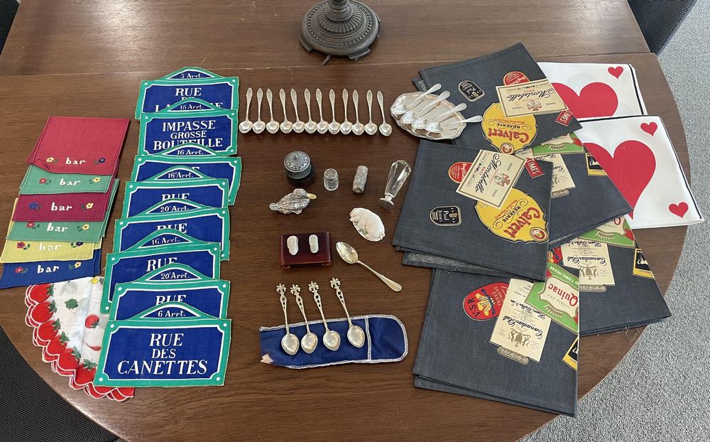 Enjoy a great collection of small antiques from Europe and Asia including small pewter duck paper weight measuring 3" x 2" in excellent condition; monogrammed signet stamp with crystal base. measuring 3.25" x 1.5" with small flea bites to corners of crystal base; set of 3 fleur-de-Lis souvenir spoons from Italy measuring 4.5" x 1.5" in excellent condition; Nymphenburg porcelain pig measuring 3" x 1.5" with large chip to base on back of piece; miniature salt shaker measuring 1.25" x 1" in excellent condition; small metal pill box on wood stand measuring 2" x 2" in excellent condition; two miniature jade pigs on wood stand measuring 1.25" x 0.75" in excellent condition; small figural stone carved weight measuring 1.75" x 1" in excellent condition; four (marked 800 silver) demitasse spoons and small 800 silver tray. Spoons measure 4.5" x 1" and tray measures 5.5" x 4" with tip of one spoon having minor corrosion; set of 12 silver plate demitasse spoons measuring 4.5" x 1" in excellent condition; set of 8 Paris, France street sign cloth coasters measuring 6.5" x 4.5" in excellent condition; signed Kreier Switzerland vegetable handkerchief measuring 13" and in excellent condition; set of six "Bar" cloth cocktail napkins measuring 8.5" x 5" in excellent condition; pair of playing card napkins measuring 15" in excellent condition; set of five cloth placemats showing vintage liquor labels measuring 16" and in excellent condition.