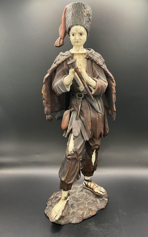 An impressive statue by artist Simon Troger (1693-1768) depicting a peasant with a horn. The man's gaunt and skeleton appearance is contrasted by his intricately and beautifully carved hat, pants and cloak. The piece, dating from the 18th century, measures approximately 13" tall and 5" wide. Condition: Missing fingers and missing wood laces to right foot. Also, evidence of repair to the right foot, left arm and where the neck meets the wooden cloak.
