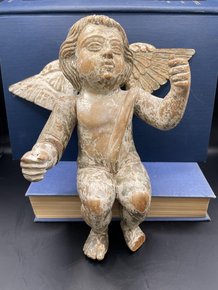 Antique European Hand Carved Wood Angel Statue. Most likely Spanish or Italian. Measures 9" tall, 9" wide, and 4" long. Chip to angel's left foot resulting in missing toes. Left wing is a more modern replacement.