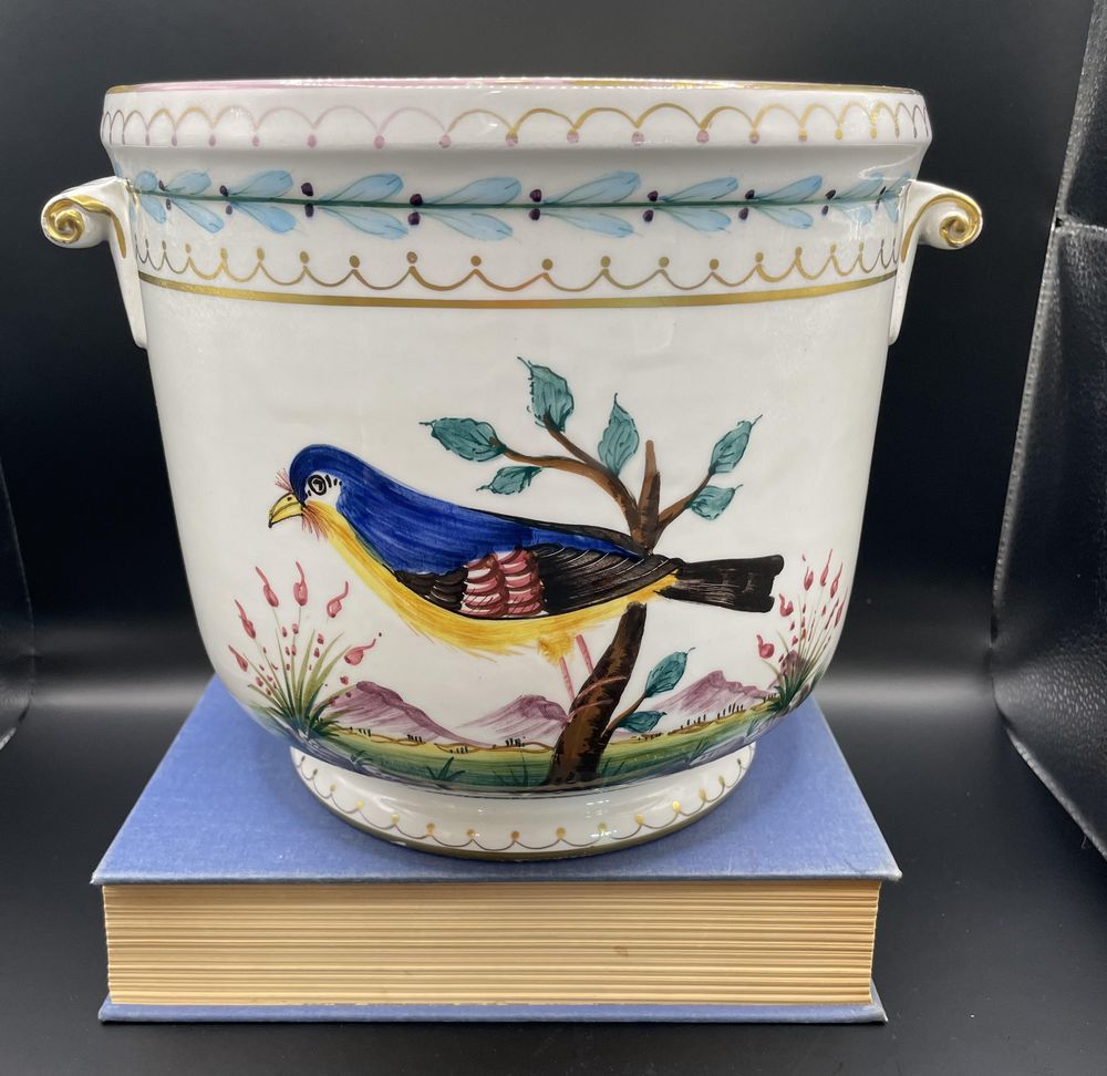 Este Ceramiche Porcellane Italy Cache Pot. Nice hand painted scene of bird with a background of Italian countryside. The rim and handles are accented with gilt gold. Measures 7.25" tall by 9.5" wide. Small losses to glaze along the rim.