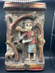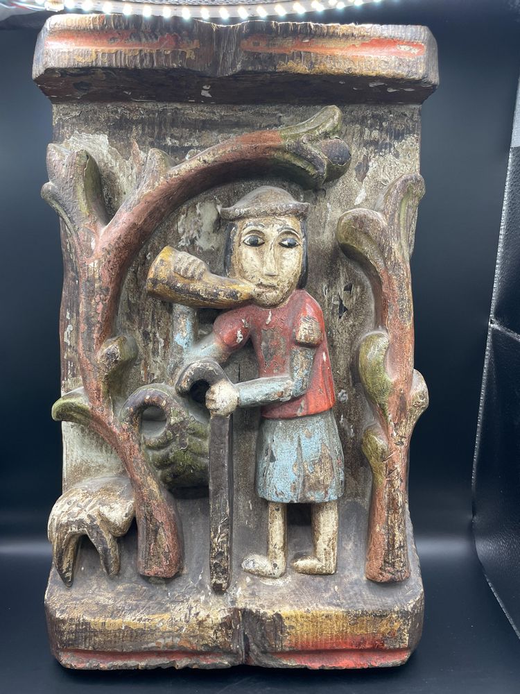 Antique Spanish Colonial Carved Wood Architectural Panel of a Shepherd with Crook. Measures 14.5" tall, 9" wide and 3" deep. Paint loss and surface wear across the panel.