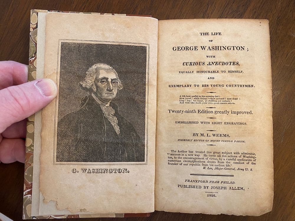First biography of George Washington, by Mason Weems. Small Octavo. Frontispiece - Portrait of George Washington, published in 1826. This is the one where Weems made up the story about Washington saying "I cannot tell a lie." 228 pages with all six engravings, as called for: 1. Portrait of George Washington 2. Defeat of General Braddock 3. Battle of Lexington 4. Battle of Bunker Hill 5. Capture of Major Andre 6. Surrender of Lord Cornwallis. A rare and interesting book.