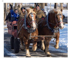 Come join DeeAnn, John and the Blumberg family for an amazing half day of family fun learning to groom, harness and drive a 5000 lb team of draft horses. We will customize your visit based on your interest, and we can teach you everything you ever wanted to know about harnessing and driving these "gentle giants". Or, if you prefer, just grab a hot cocoa, relax, and enjoy a peaceful ride on one of our wagons or sleighs. 10 adults maximum.