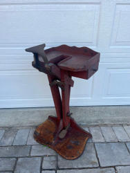 This harness / leathermaker’s vice came from the summer home of Justice Charles H. Robb 1867-1939. Justice Robb was a US appeals judge from 1906 until 1937. It includes some original tools, and measures 28 inches tall. Courtesy of his Great-Granddaughter Melissa Billings and her husband Rick Soedler. The harness / leather maker’s vise was an invaluable tool allowing the craftsman to precisely hold and steady the item on which he was working. It essentially gave the worker an extra set of hands. The harness-maker’s vise was sometimes referred to as a saddle-maker’s vise when being used for that purpose. The pedal at the base has an adjustable bar to allow the vise to be opened and closed without using one’s hands.