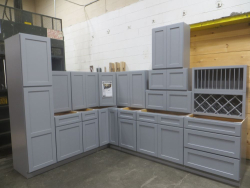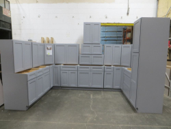 Pacific Gray Kitchen Cabinet Set 10'x15'. Deluxe Layout, 30" Walls, By GHI, Additional pieces may be available for order to the high bidder. Additional cabinets ship boxed, ready to assemble. -3/4” Solid Wood Face Frame -High Density Fiberboard Shaker Style Door and Drawer Front -1/2” Plywood Box Construction -5/8” Plywood Shelves -Full Overlay Doors and Drawer Fronts -Solid Wood Dovetail Drawer box -Soft Close Full Extension Drawer Gliders -Soft Close Doors -6-Way Adjustable Concealed Hinges Cabinet Assembly Option IS NOT Available on this kitchen cabinet set. This set is UNASSEMBLED.  Enclosed in each cabinet set will be a Build Sheet which lists the individual cabinets in each set. As the cabinets are palletized each cabinet will be checked off and signed by our staff member to ensure that the set is complete at the time of pick-up. Please keep this Build Sheet on hand because it will be required if there is an issue with your cabinet set. Cabinet issues will not be addressed without this build sheet. Weight: X. Sold by: Set. Sold as: Price X Quantity. Inventory #: PCG-C 10x15 W30 DLX