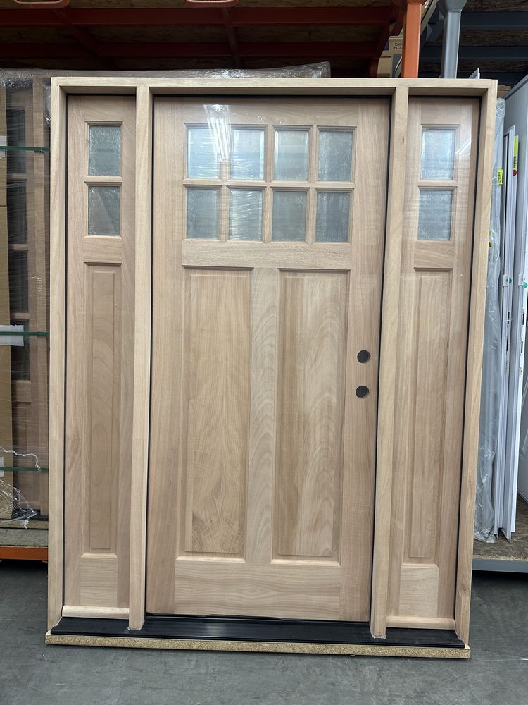 Exterior 8-Lite Square Craftsman Style Mahogany Door 1-3-1, LH. Pre-Hung: 36"x80" Door, 2 12"x80" Sidelites, Sill 5 9/16", Rough Opening: 64 3/4"W x 83 1/4"H, Grade: 1st. Weight: x. Sold by: Door. Sold as: Price X Quantity. Inventory #: 5213-PT-M15-T LH