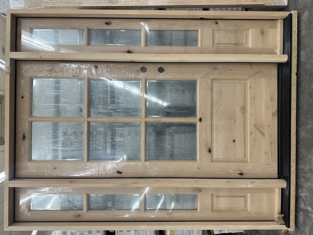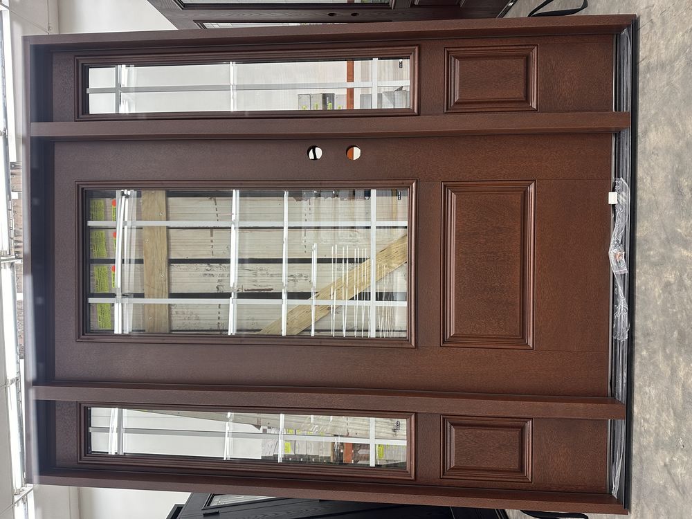 Stained, Entrance Door 36"x80" With 2 Sidelites, RH. Pre-Hung 2-12" 2-Panel Sidelites, Door is 4 Lite, Actual Dimensions 63 1/2"x81 1/2", Grade: A. Weight: 245. Sold by: Door. Sold as: Price X Quantity. Inventory #: 5210-EXT FG 1-3-1 RH