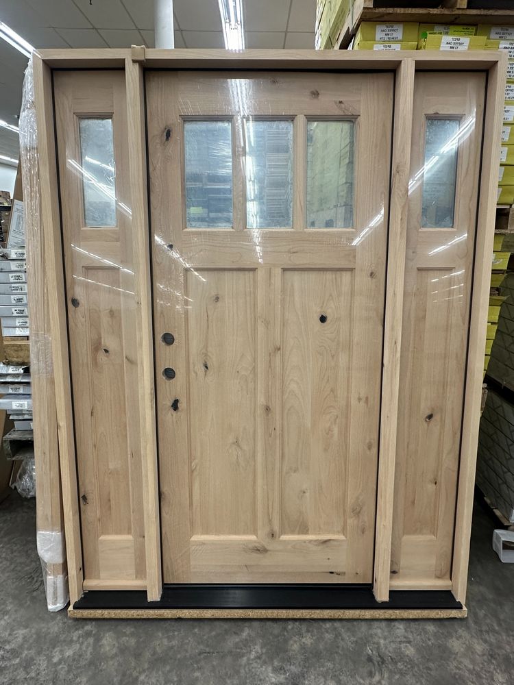 Exterior 3-Lite Square Craftsman Style Knotty Alder Door 1-3-1, RH. Pre-Hung: 36"x80" Door, 2 12"x80" Sidelites, Sill 5 9/16", Rough Opening: 64 3/4"W x 83 1/4"H, Grade: 1st. Weight: x. Sold by: Door. Sold as: Price X Quantity. Inventory #: 5214-PT-A06-T RH