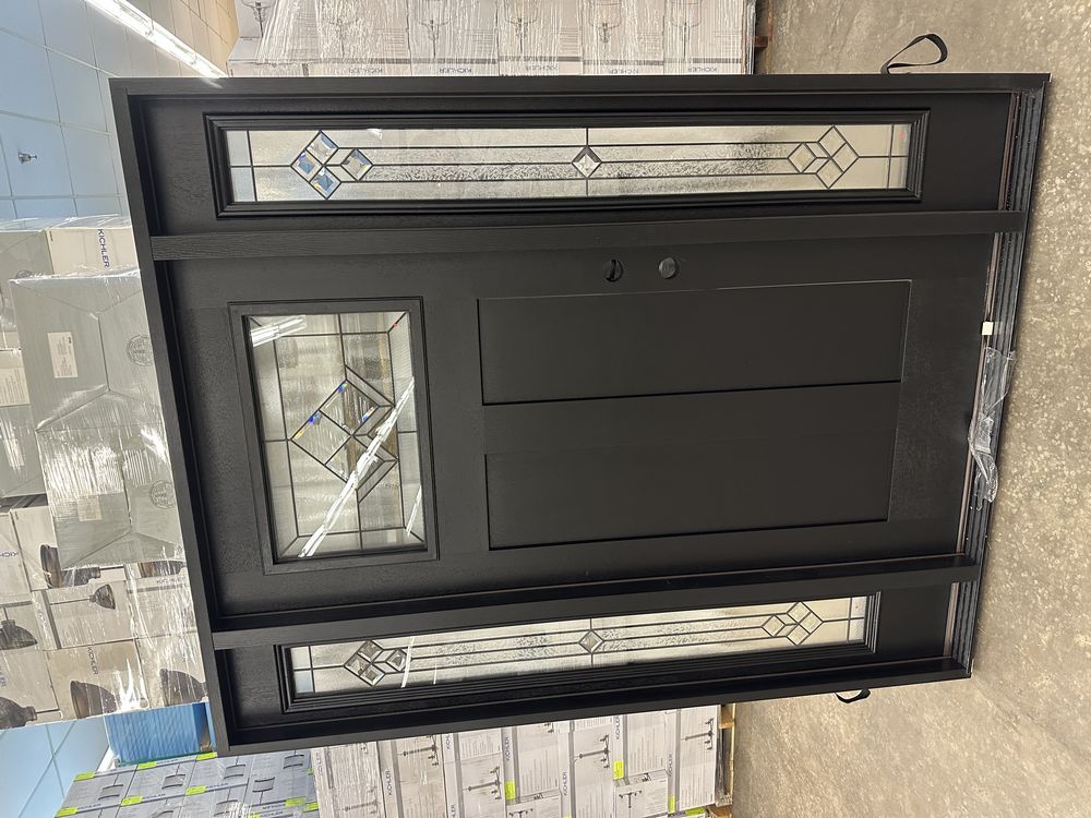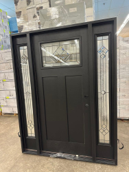 Exterior Fiberglass Deco Door With 2 Side Lites 63 1/2"x81 1/2" LH. Black Finish, 2-12" Side Lites, 36" Decorative Door, 3/4"x4 1/2" Jambs, 14 1/2"x24 1/4" Glass, War and Peace Pattern, Grade: A. Weight: 180. Sold by: Door. Sold as: Price X Quantity. Inventory #: 5210-EXT FG W&P BLK 1-3-1