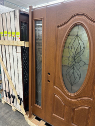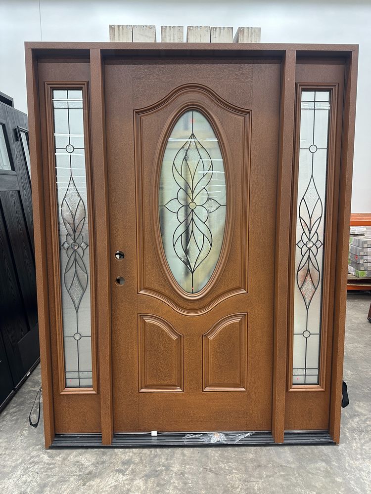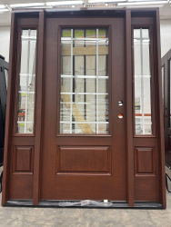 Exterior Fiberglass Deco Door With 2 Side Lites 63 1/2"x81 1/2" LH. Stained Finish, 2-12" Side Lites, 36" Decorative Door, 3/4"x4 1/2" Jambs, 14 1/2"x24 1/2" Glass, GBG Pattern, Grade: A. Weight: 180. Sold by: Door. Sold as: Price X Quantity. Inventory #: 5210-EXT FG GBG STND 1-3-1