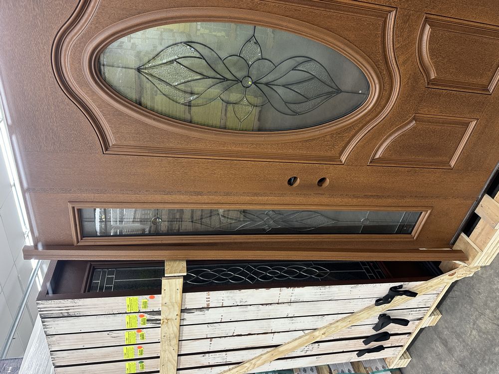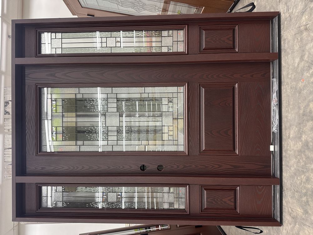 Exterior Fiberglass Deco Door With 2 Side Lites 63 1/2"x81 1/2" RH. Stained Finish, 2-12" Side Lites, 36" Decorative Door, 3/4"x4 1/2" Jambs, 14 1/2"x24 1/2" Glass, Chang'An Pattern, Grade: A. Weight: 180. Sold by: Door. Sold as: Price X Quantity. Inventory #: 5210-EXT FG CH'A STND 1-3-1