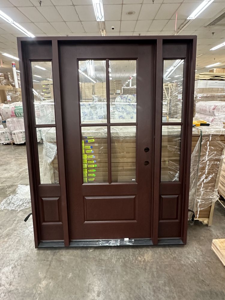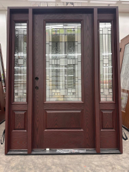 Exterior Fiberglass Deco Door With 2 Side Lites 63 1/2"x81 1/2" RH. Stained Finish, 2-12" Side Lites, 36" Decorative Door, 3/4"x4 1/2" Jambs, 14 1/2"x24 1/2" Glass, Red & Black Patina Pattern, Grade: A. Weight: 180. Sold by: Door. Sold as: Price X Quantity. Inventory #: 5210-EXT FG R&BP STND 1-3-1