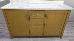 Mayapple 60"x22"x34" Almond Toffee Double Basin Vanity. By Home Decorators Collection, Actual Dimensions 60"x22"x34 1/2", Engineered Stone Top With 60" Backsplash, Chrome Finish Hardware, Grade: 1st Quality. Weight: 335. Sold by: Piece. Sold as: Price X Quantity. Inventory #: 5081-1007631062