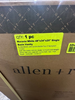 Moravia White 48"x34"x20" Single Basin Vanity. By Allen & Roth, With Carrara Marble Top, 4" Backsplash Included, Grade: 1st Quality. Weight: 298. Sold by: Piece. Sold as: Price X Quantity. Inventory #: 5081-50806-1083182