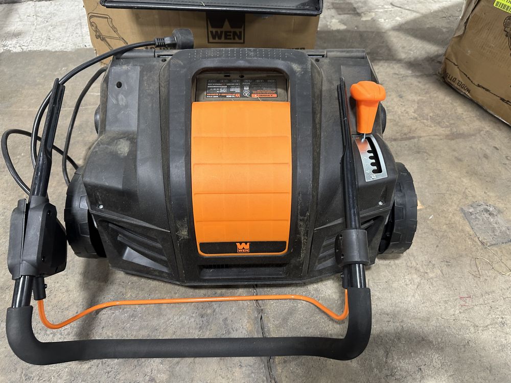 WEN DT1516 16-Inch 15-Amp 2-in-1 Electric Dethatcher and Scarifier with Collection Bag. The control panel on side of handle has had its screws pull loose. May be missing small hardware pieces. 5-position height adjustment ranges from a +1/4 to -1/2-inch raking depth Powerful 13-amp electric motor generates up to 3300 RPM with a 15-inch clearing path 16-blade scarifying head helps aerate your grass for a healthier and thicker lawn Dethatching head features 24 steel tines for maximum thatch pickup, allowing your soil better access to nutrients, air, and water Features a detachable thatch collection bag, automatic overload shutdown to protect the motor, a scarifying head, a dethatching head. Weight: . Sold by: . Sold as: Price X Quantity. Inventory #: