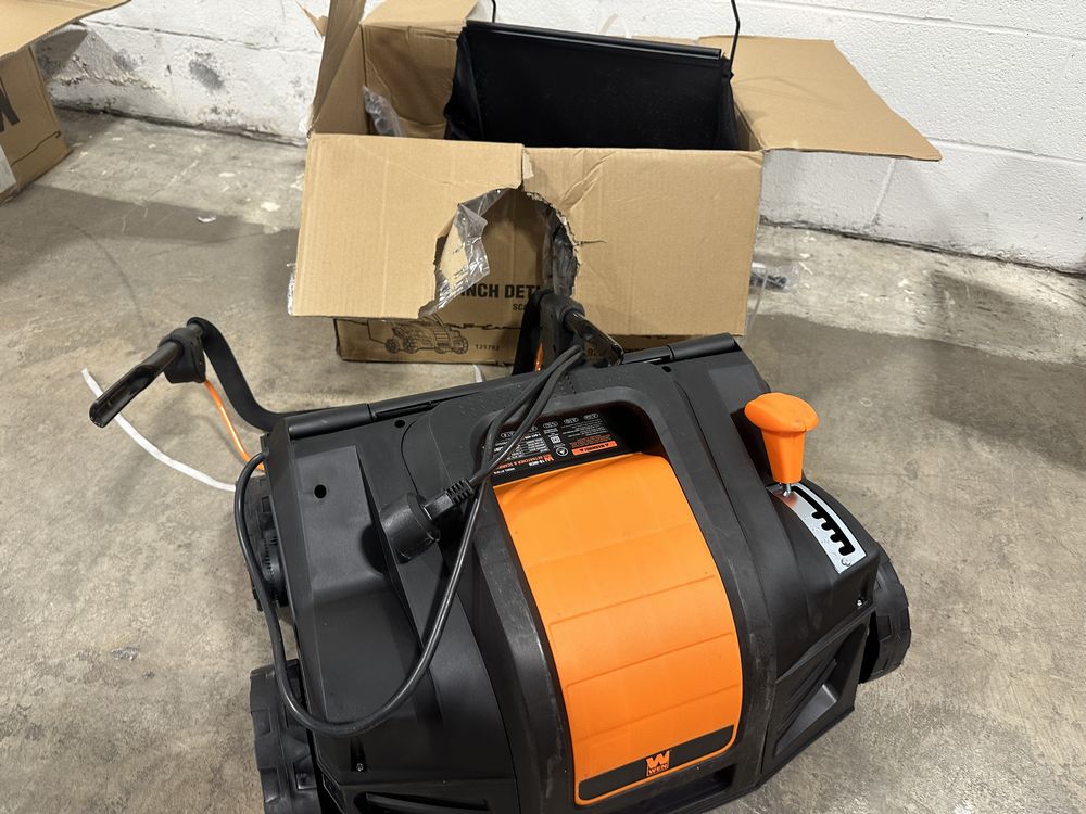 WEN DT1516 16-Inch 15-Amp 2-in-1 Electric Dethatcher and Scarifier with Collection Bag. Light Use. May be missing small hardware pieces. 5-position height adjustment ranges from a +1/4 to -1/2-inch raking depth Powerful 13-amp electric motor generates up to 3300 RPM with a 15-inch clearing path 16-blade scarifying head helps aerate your grass for a healthier and thicker lawn Dethatching head features 24 steel tines for maximum thatch pickup, allowing your soil better access to nutrients, air, and water Features a detachable thatch collection bag, automatic overload shutdown to protect the motor, a scarifying head, a dethatching head. Weight: . Sold by: . Sold as: Price X Quantity. Inventory #:
