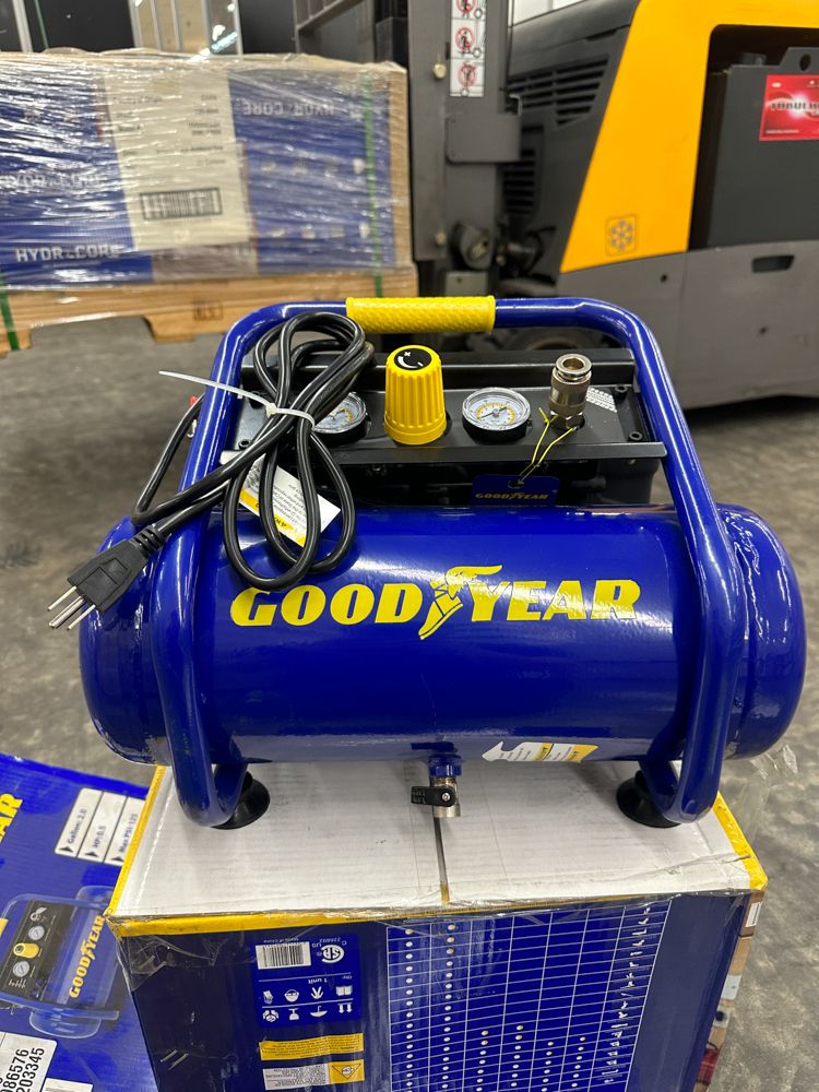 2 Gallon Oil Free Air Compressor. By Good Year, HP: 0.5, 1.2 SCFM @40 PSI, 0.8 SCFM @90 PSI, 58 dBA Quiet, Grade: New. Weight: 35. Sold by: Piece. Sold as: Price X Quantity. Inventory #: 4858-TAW-0508S