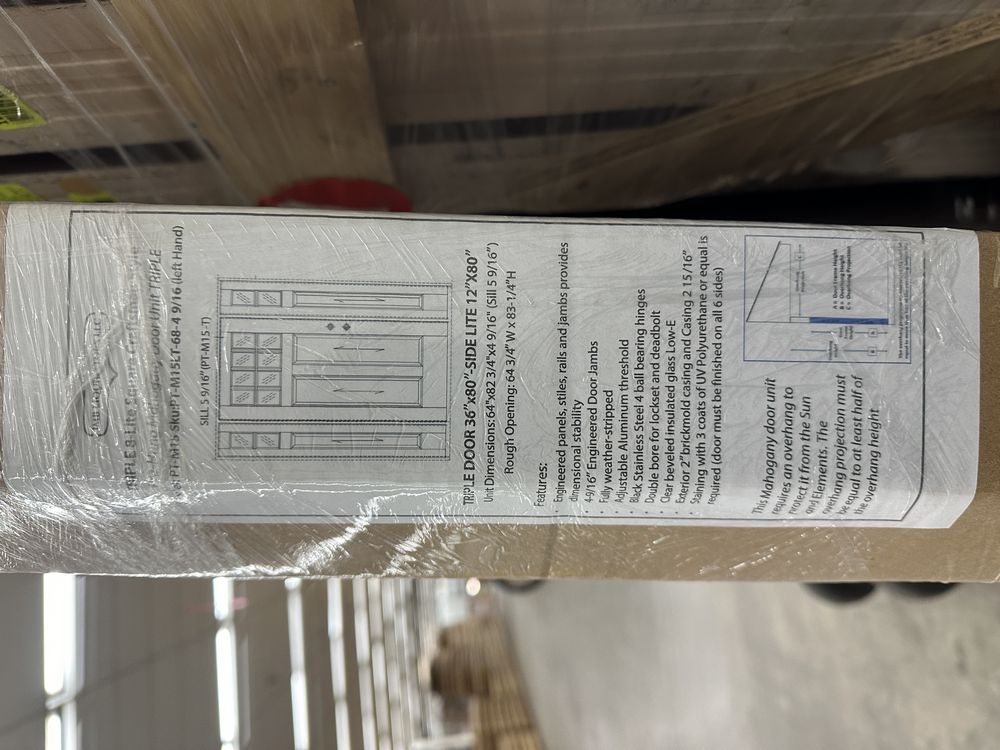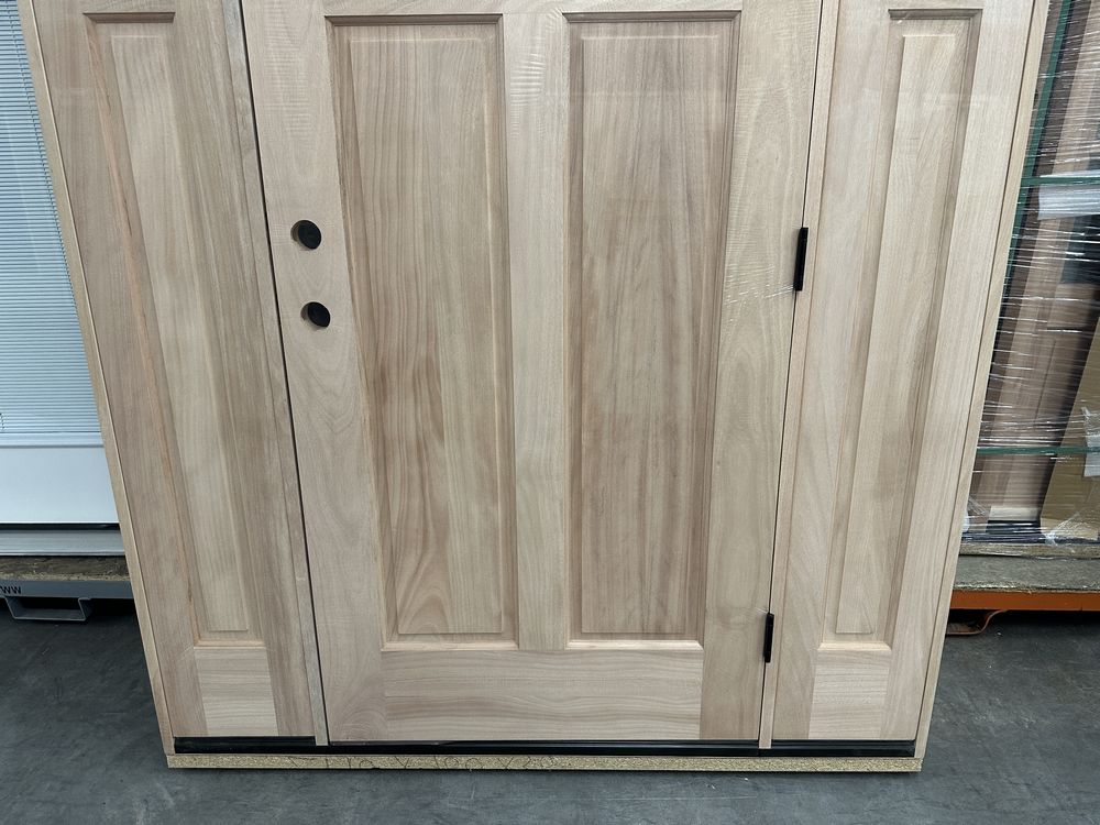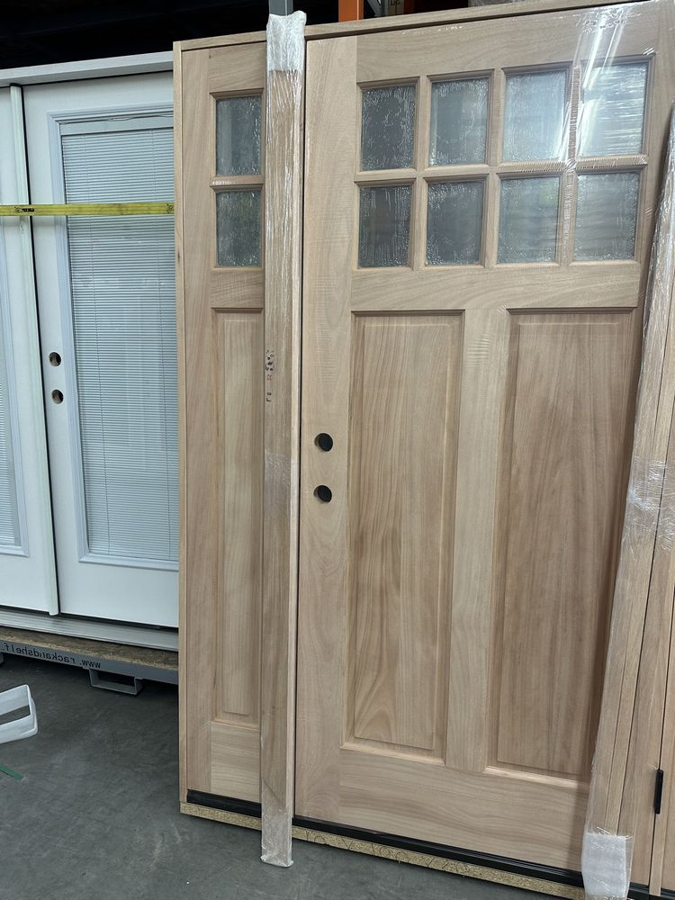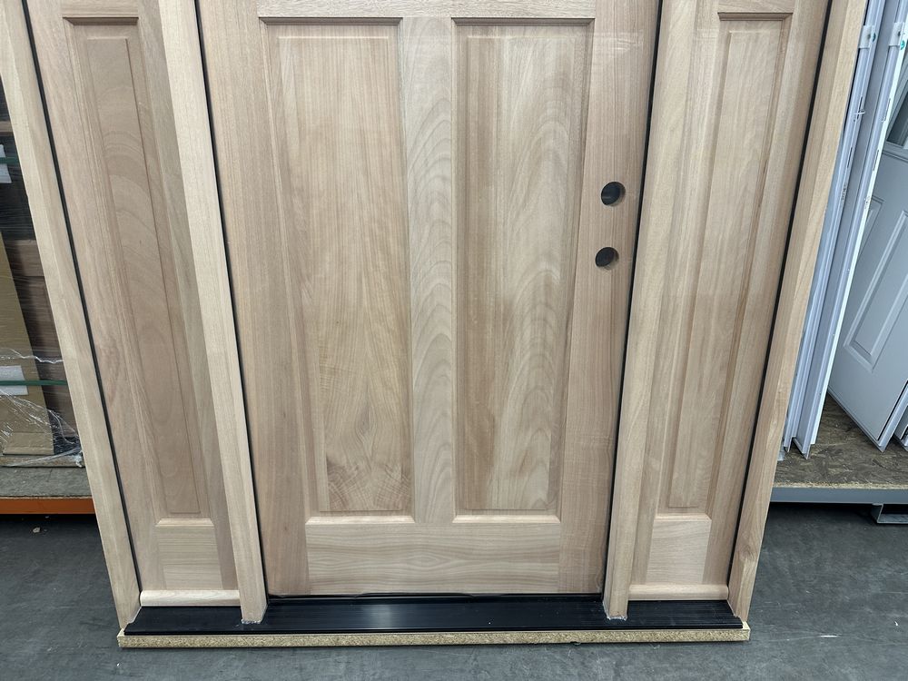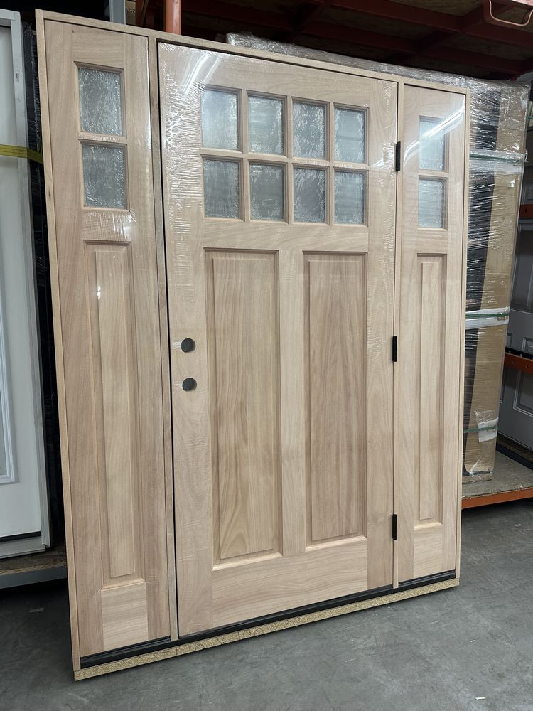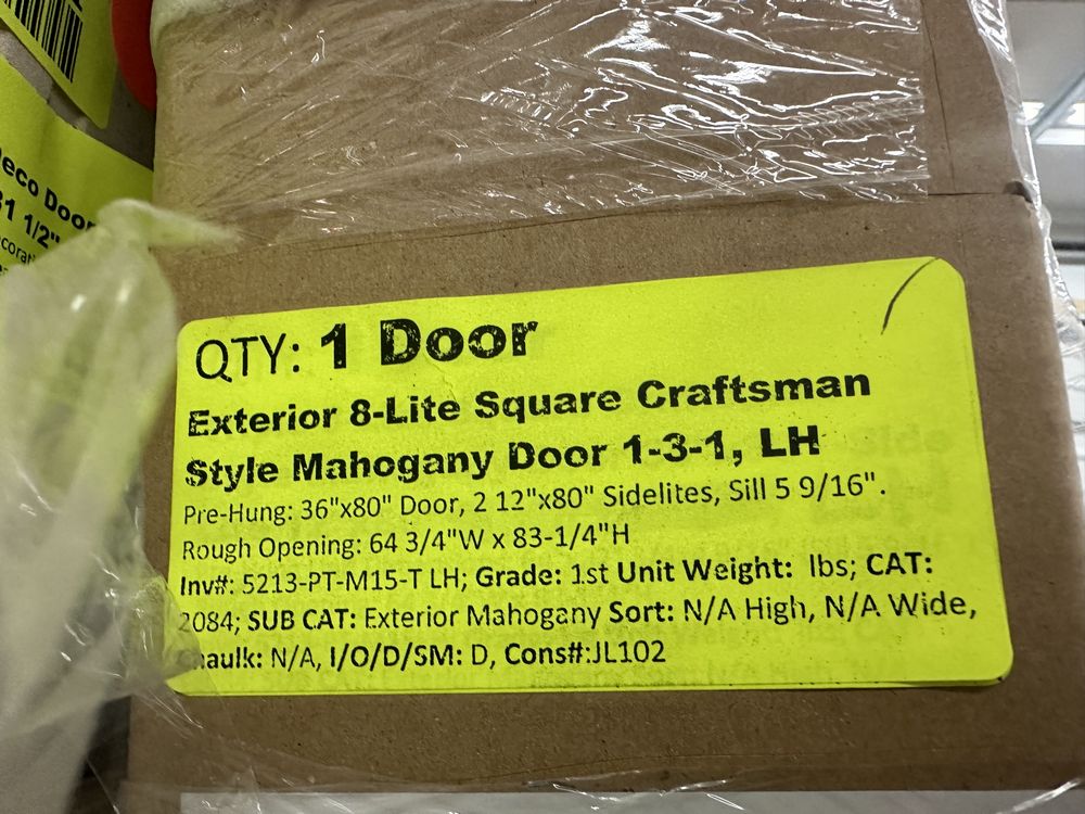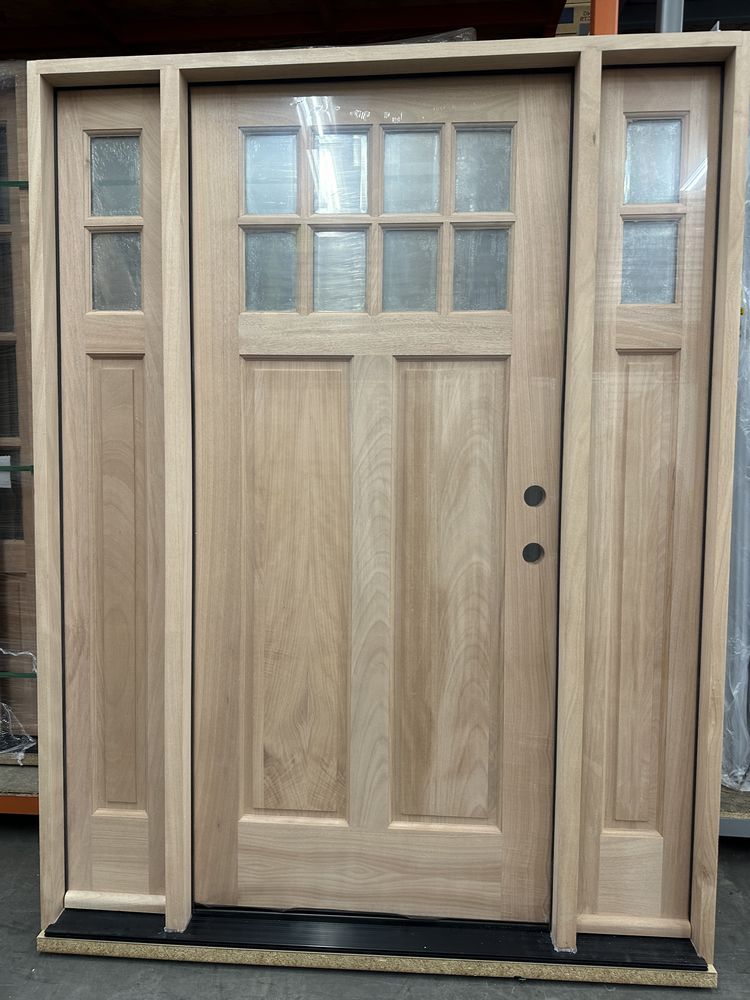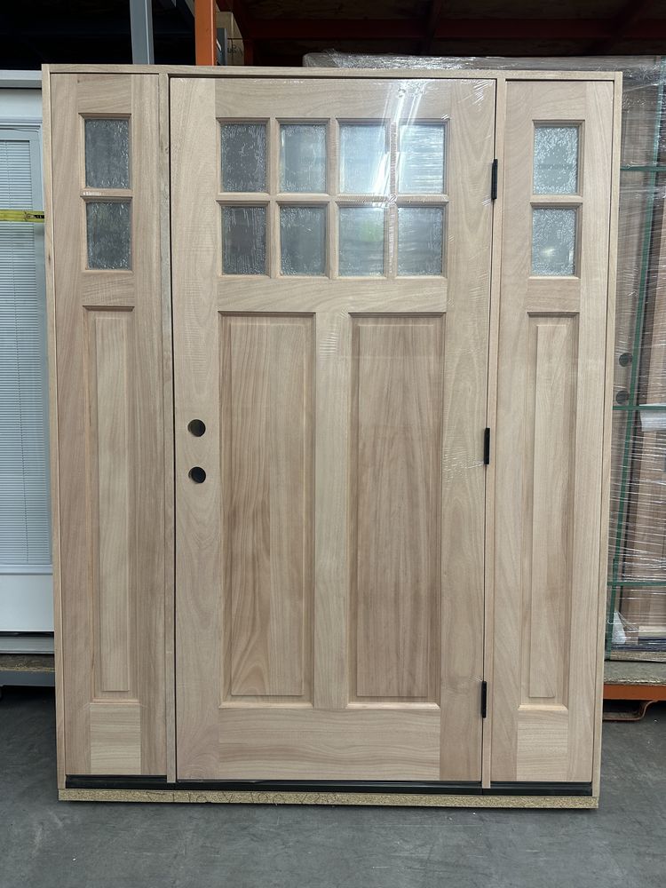 Exterior 8-Lite Square Craftsman Style Mahogany Door 1-3-1, LH. Pre-Hung: 36"x80" Door, 2 12"x80" Sidelites, Sill 5 9/16", Rough Opening: 64 3/4"W x 83 1/4"H, Grade: 1st. Weight: x. Sold by: Door. Sold as: Price X Quantity. Inventory #: 5213-PT-M15-T LH