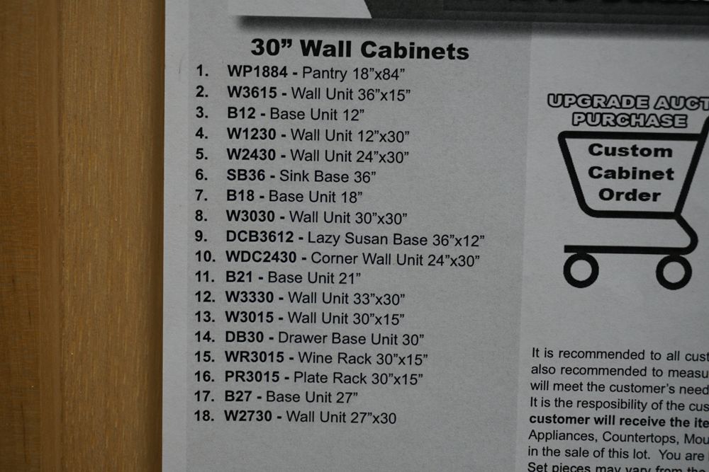 Frontier Shaker Kitchen Cabinet Set 12'x15'. Deluxe Layout, 30" Walls, By GHI. Additional pieces may be available for order to the high bidder. 3/4” Solid Wood Face Frame -Solid Wood Shaker Style Doors Frames and Drawer Fronts with Knots -1/2” Plywood Box Construction with Wood Veneer Interiors and Exteriors -3/4” plywood Shelves -Full overlay Doors and Drawer Fronts -3/4" Solid Wood Dovetail Drawer Box -Soft Close Full Extension Drawer Gliders -6-Way Adjustable Concealed Hinges -Soft Close. Cabinet Assembly Option IS NOT Available on this kitchen cabinet set. This set is UNASSEMBLED. Enclosed in each cabinet set will be a Build Sheet which lists the individual cabinets in each set. As the cabinets are palletized each cabinet will be checked off and signed by our staff member to ensure that the set is complete at the time of pick-up. Please keep this Build Sheet on hand because it will be required if there is an issue with your cabinet set. Cabinet issues will not be addressed without this build . Weight: x. Sold by: Set. Sold as: Price X Quantity. Inventory #: FTS-C 12X15 W30 DLX