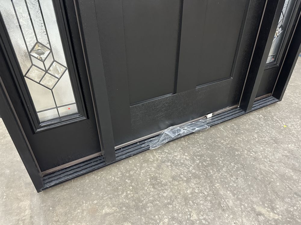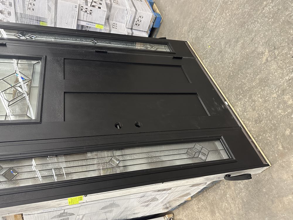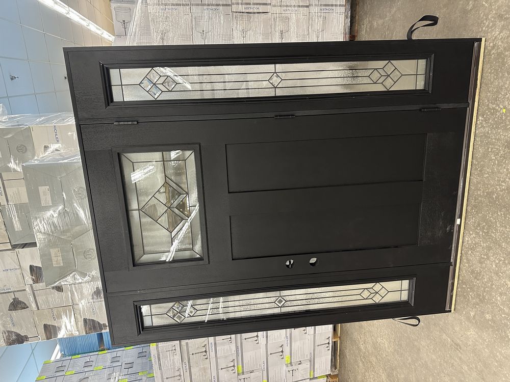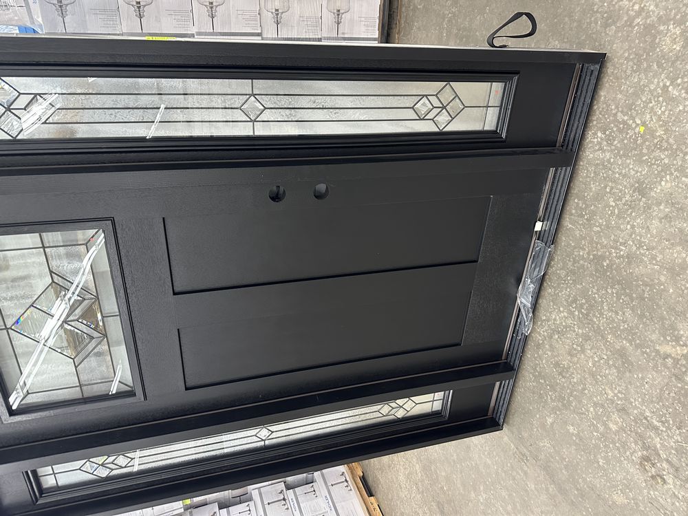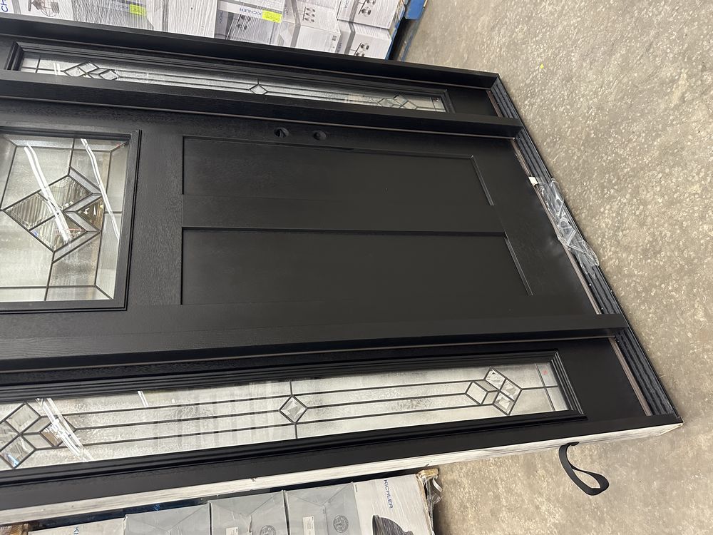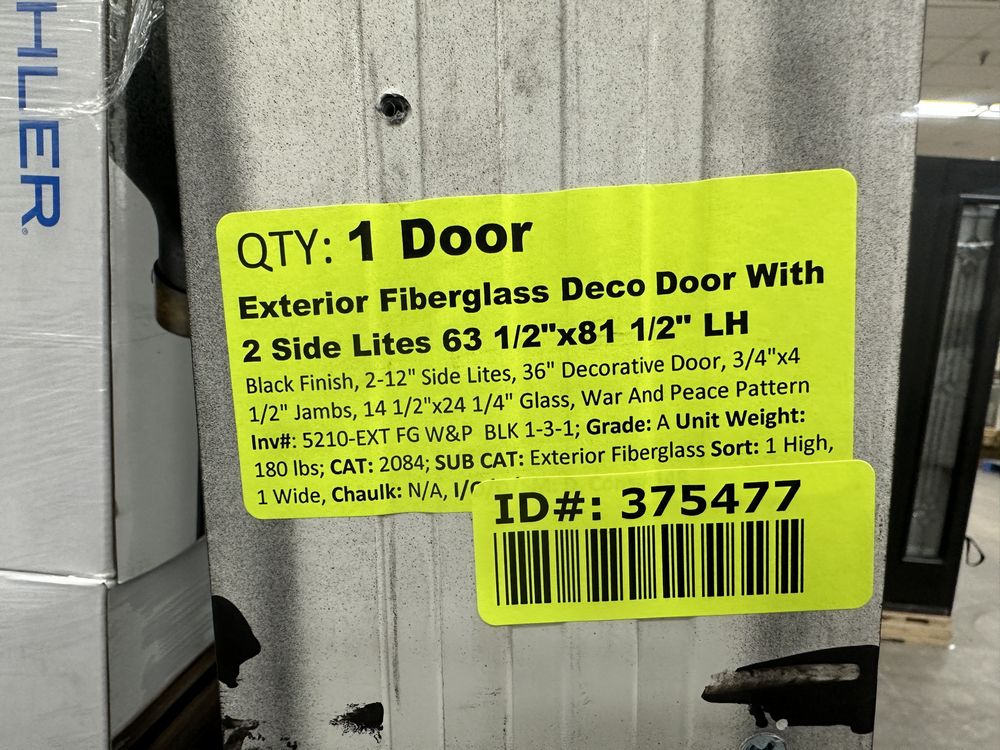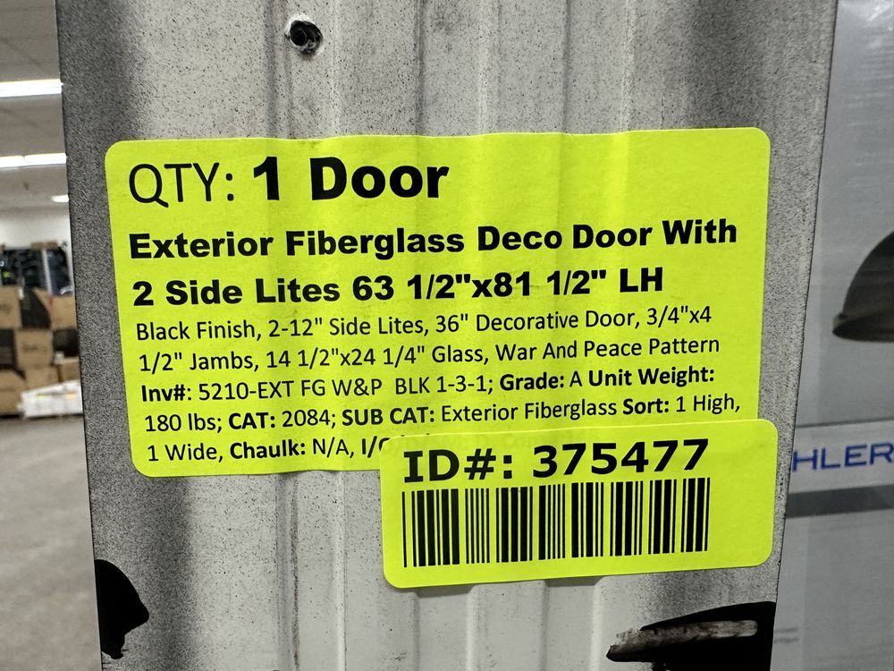 Exterior Fiberglass Deco Door With 2 Side Lites 63 1/2"x81 1/2" LH. Black Finish, 2-12" Side Lites, 36" Decorative Door, 3/4"x4 1/2" Jambs, 14 1/2"x24 1/4" Glass, War and Peace Pattern, Grade: A. Weight: 180. Sold by: Door. Sold as: Price X Quantity. Inventory #: 5210-EXT FG W&P BLK 1-3-1