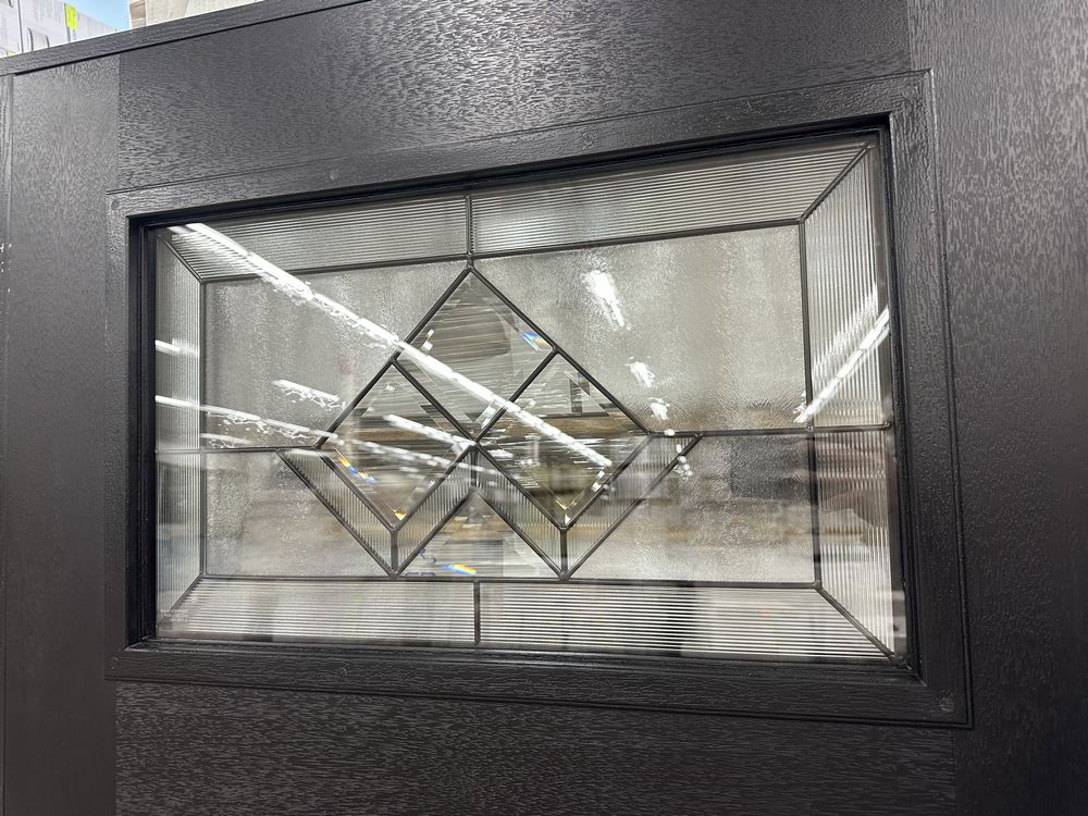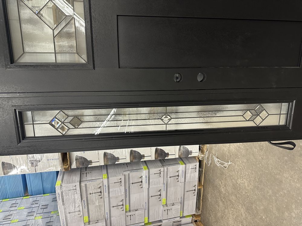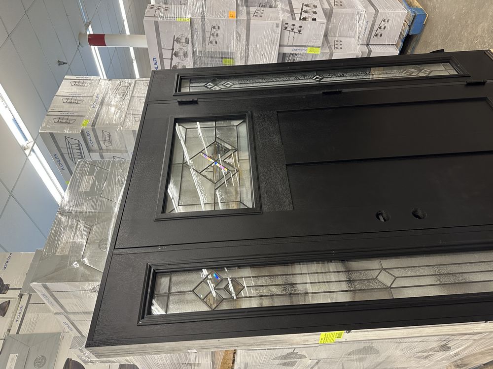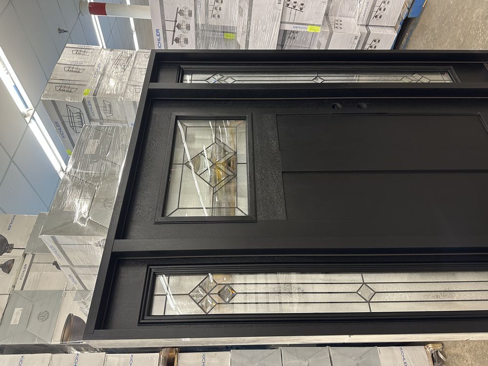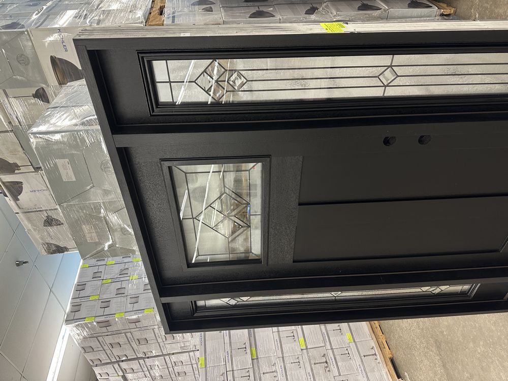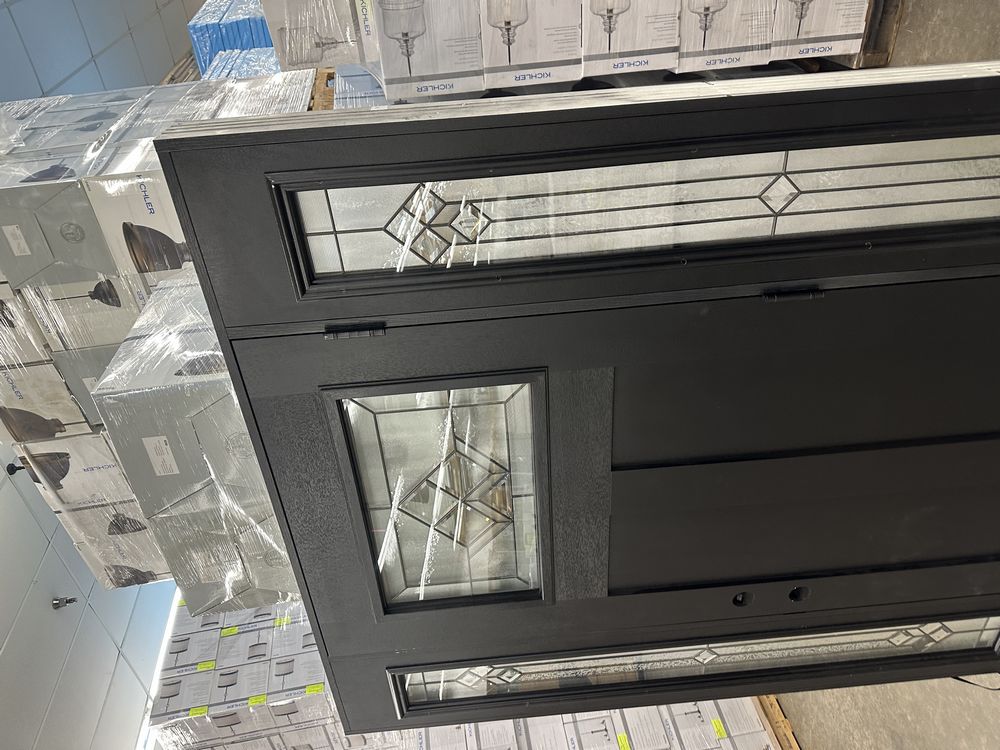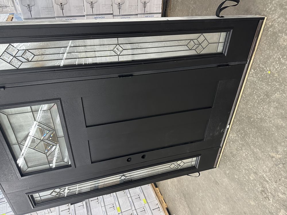 Exterior Fiberglass Deco Door With 2 Side Lites 63 1/2"x81 1/2" LH. Black Finish, 2-12" Side Lites, 36" Decorative Door, 3/4"x4 1/2" Jambs, 14 1/2"x24 1/4" Glass, War and Peace Pattern, Grade: A. Weight: 180. Sold by: Door. Sold as: Price X Quantity. Inventory #: 5210-EXT FG W&P BLK 1-3-1