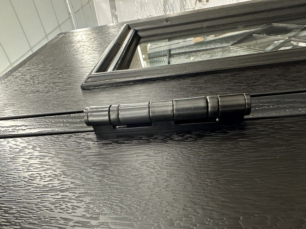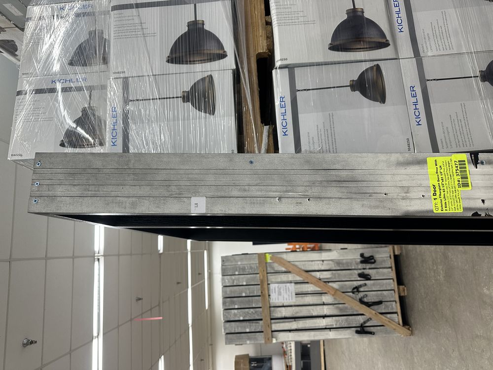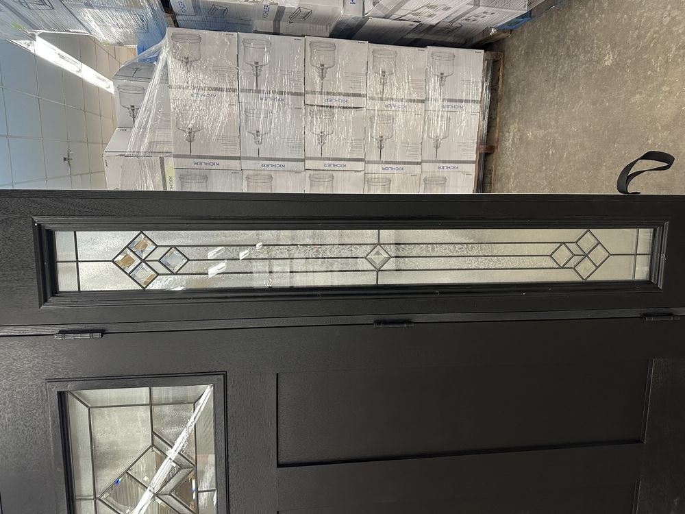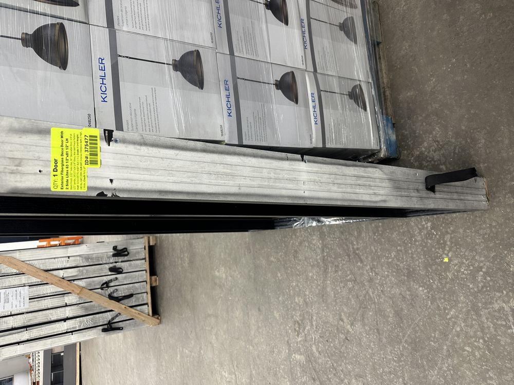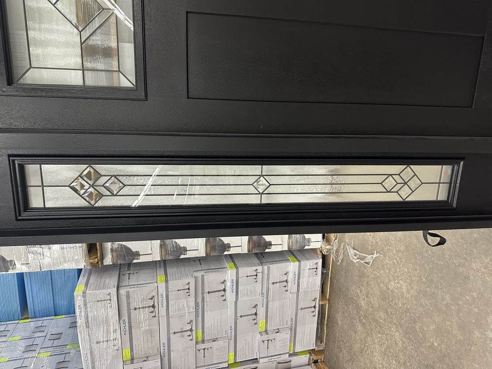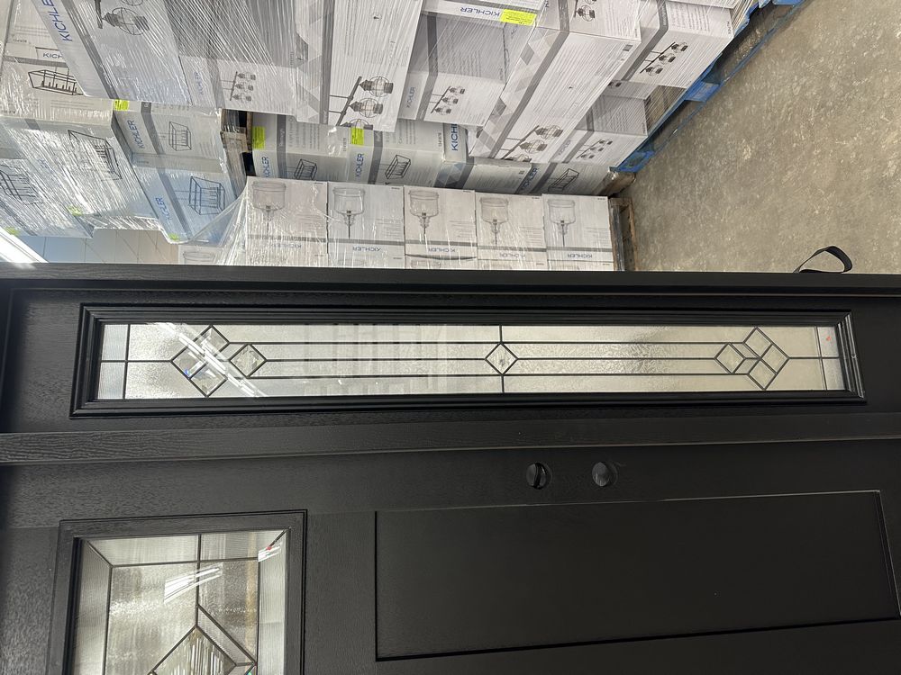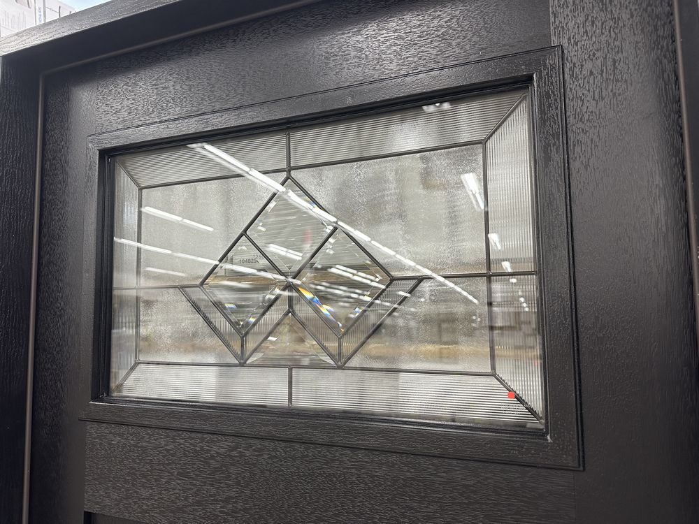 Exterior Fiberglass Deco Door With 2 Side Lites 63 1/2"x81 1/2" LH. Black Finish, 2-12" Side Lites, 36" Decorative Door, 3/4"x4 1/2" Jambs, 14 1/2"x24 1/4" Glass, War and Peace Pattern, Grade: A. Weight: 180. Sold by: Door. Sold as: Price X Quantity. Inventory #: 5210-EXT FG W&P BLK 1-3-1