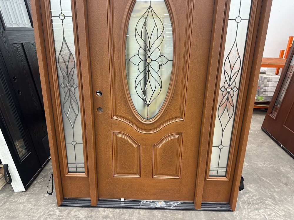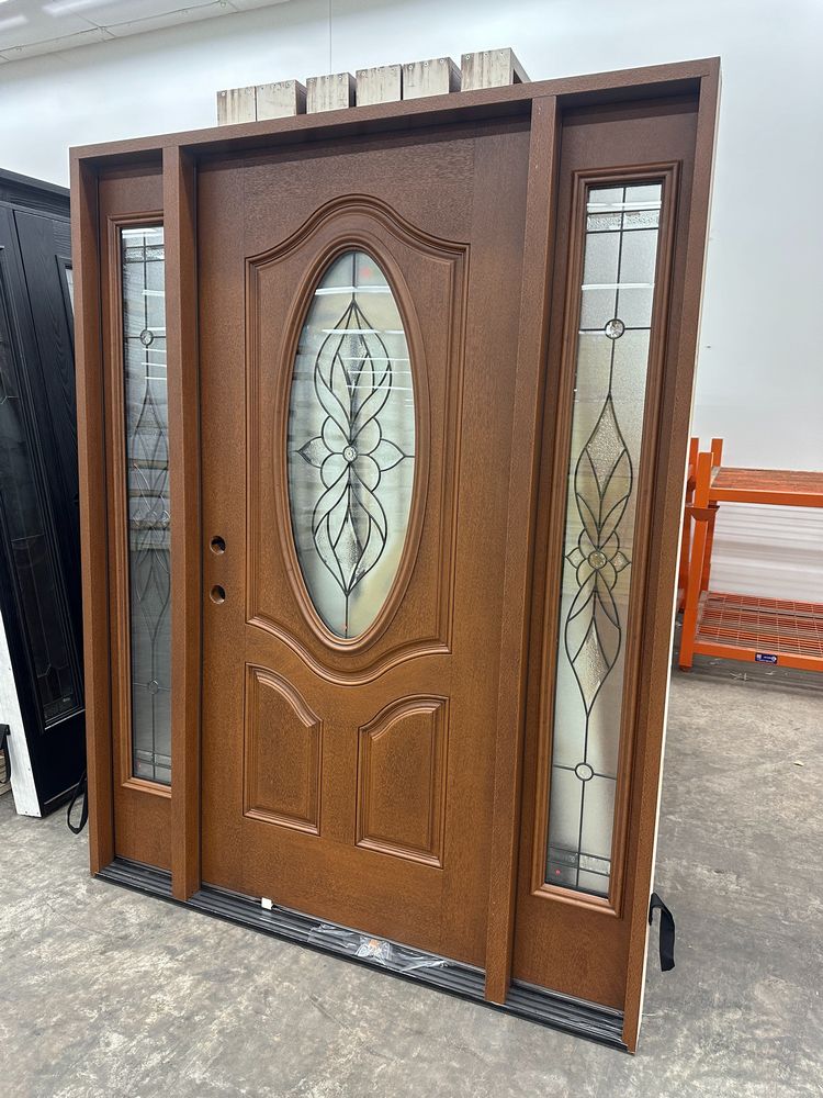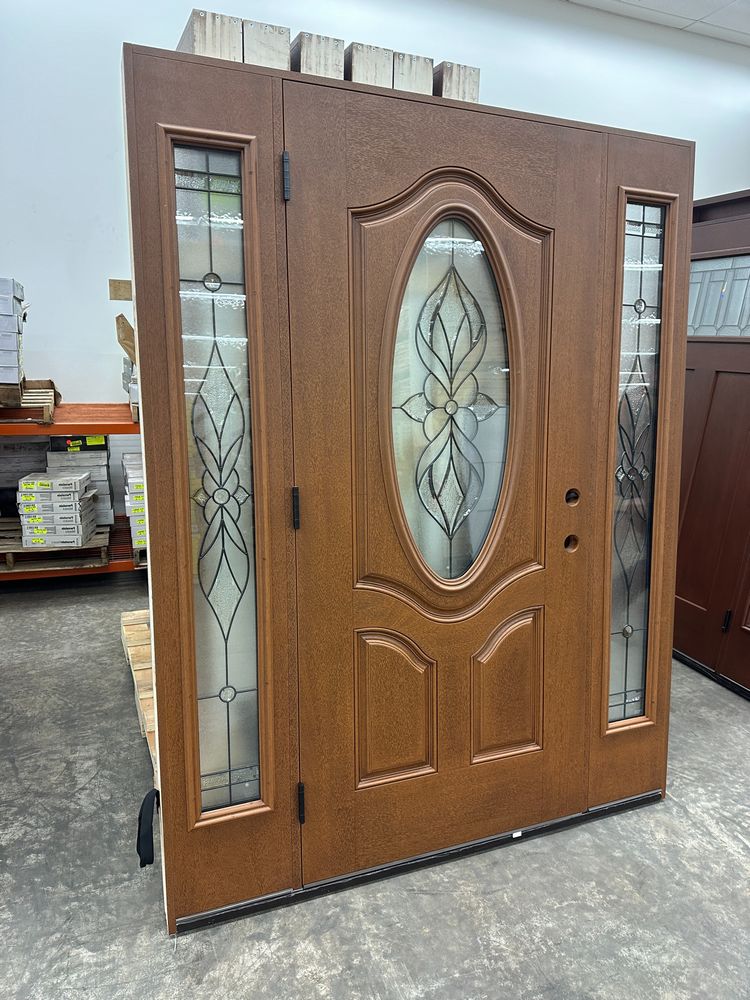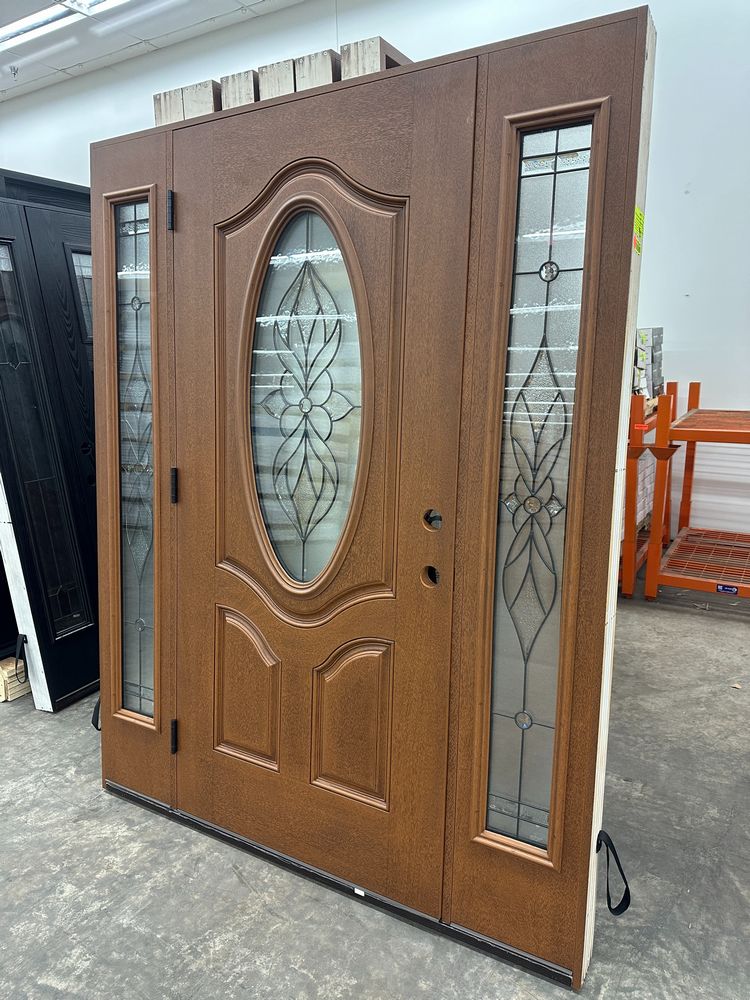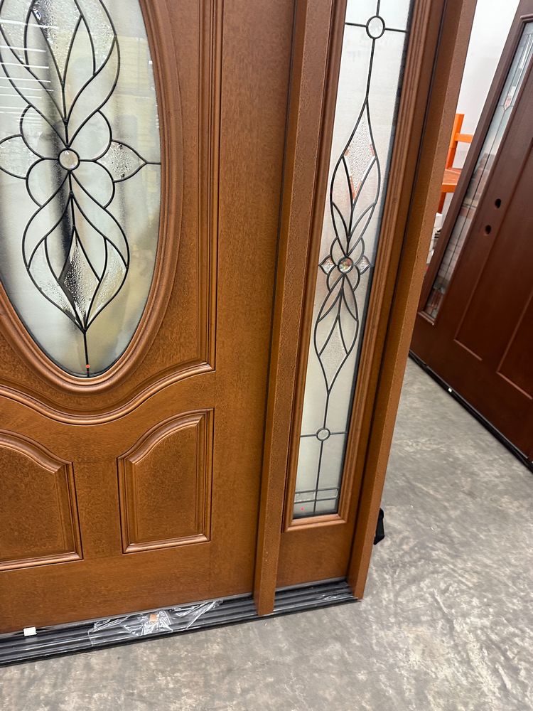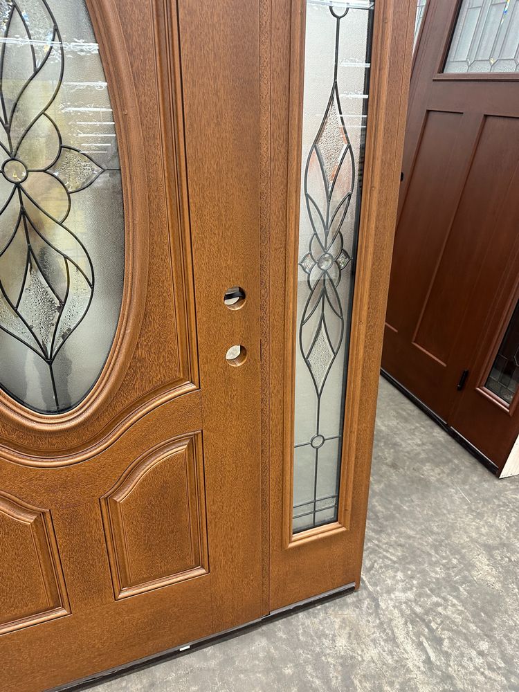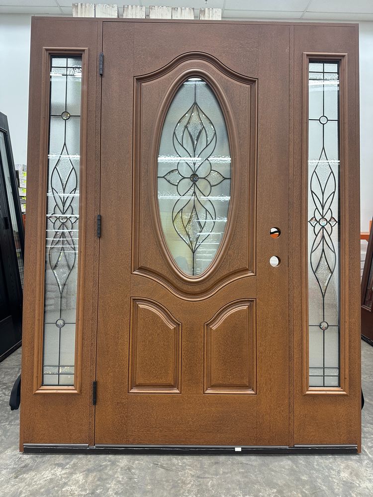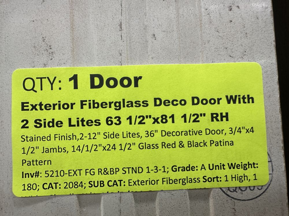 Exterior Fiberglass Deco Door With 2 Side Lites 63 1/2"x81 1/2" RH. Stained Finish, 2-12" Side Lites, 36" Decorative Door, 3/4"x4 1/2" Jambs, 14 1/2"x24 1/2" Glass, Red & Black Patina Pattern, Grade: A. Weight: 180. Sold by: Door. Sold as: Price X Quantity. Inventory #: 5210-EXT FG R&BP STND 1-3-1