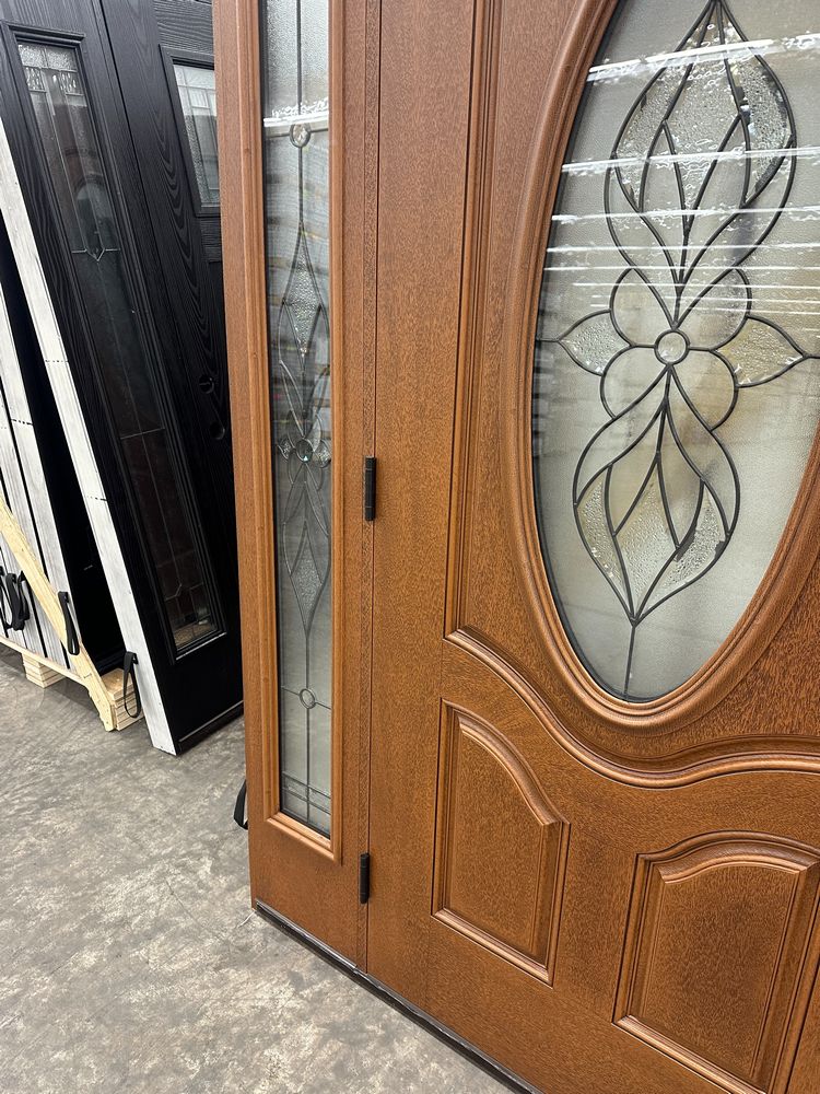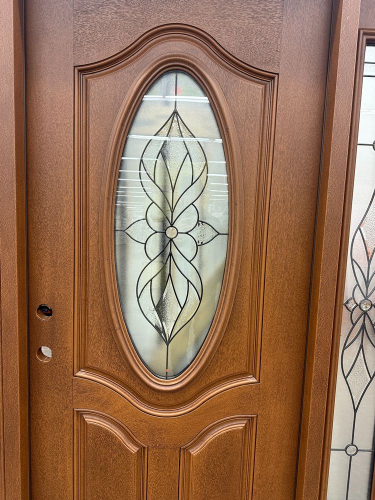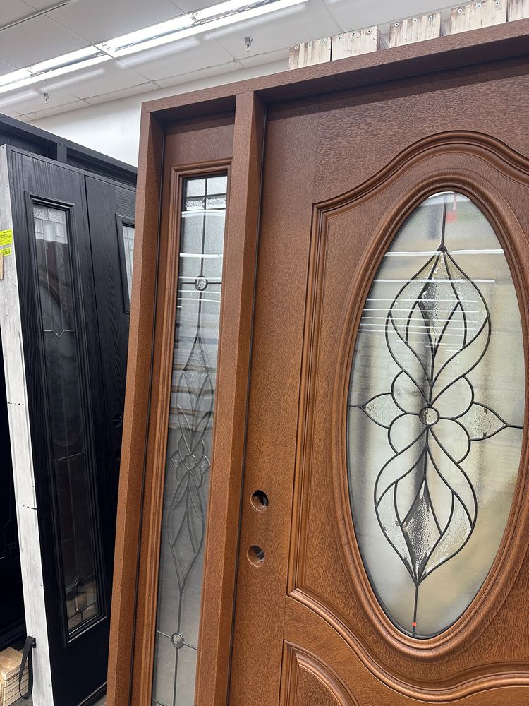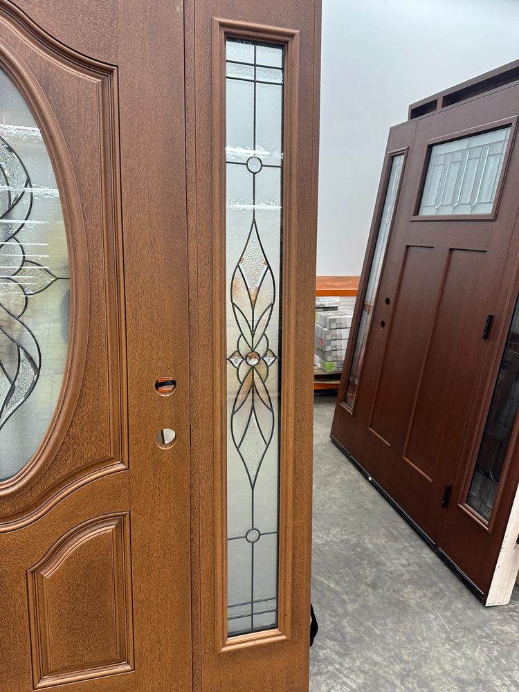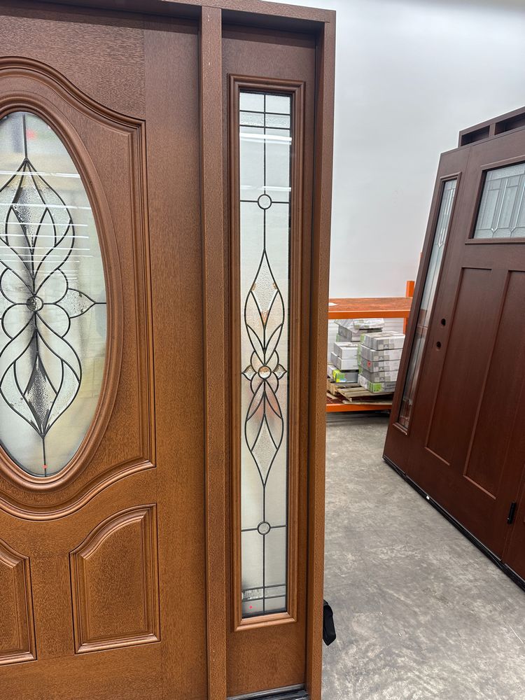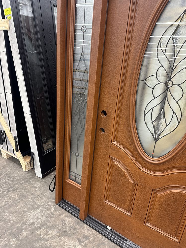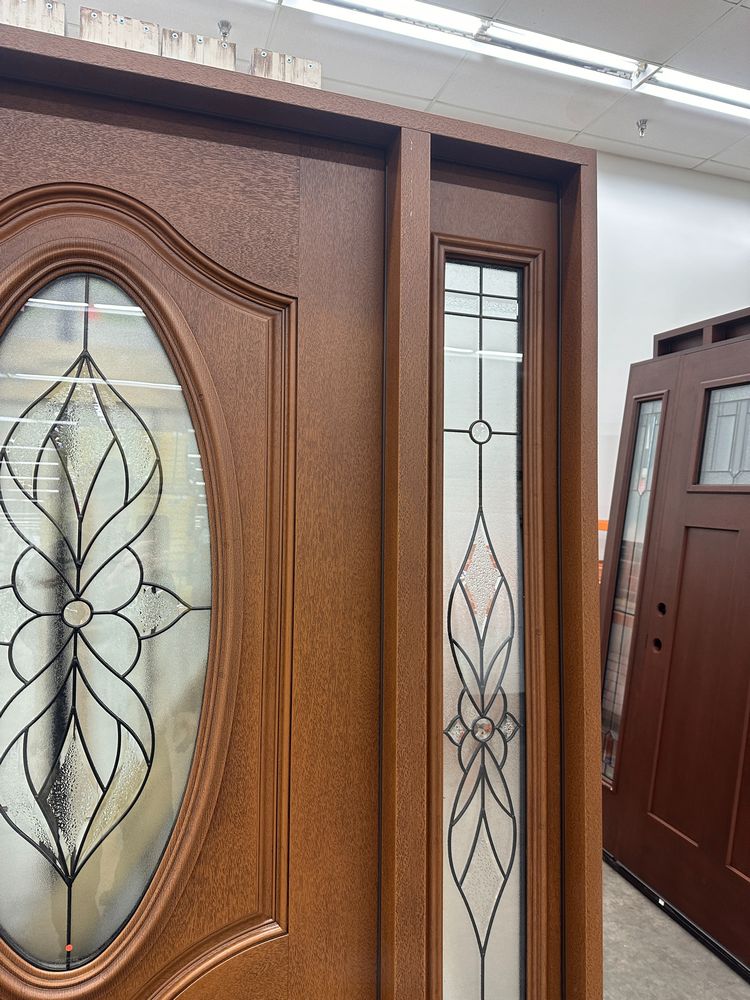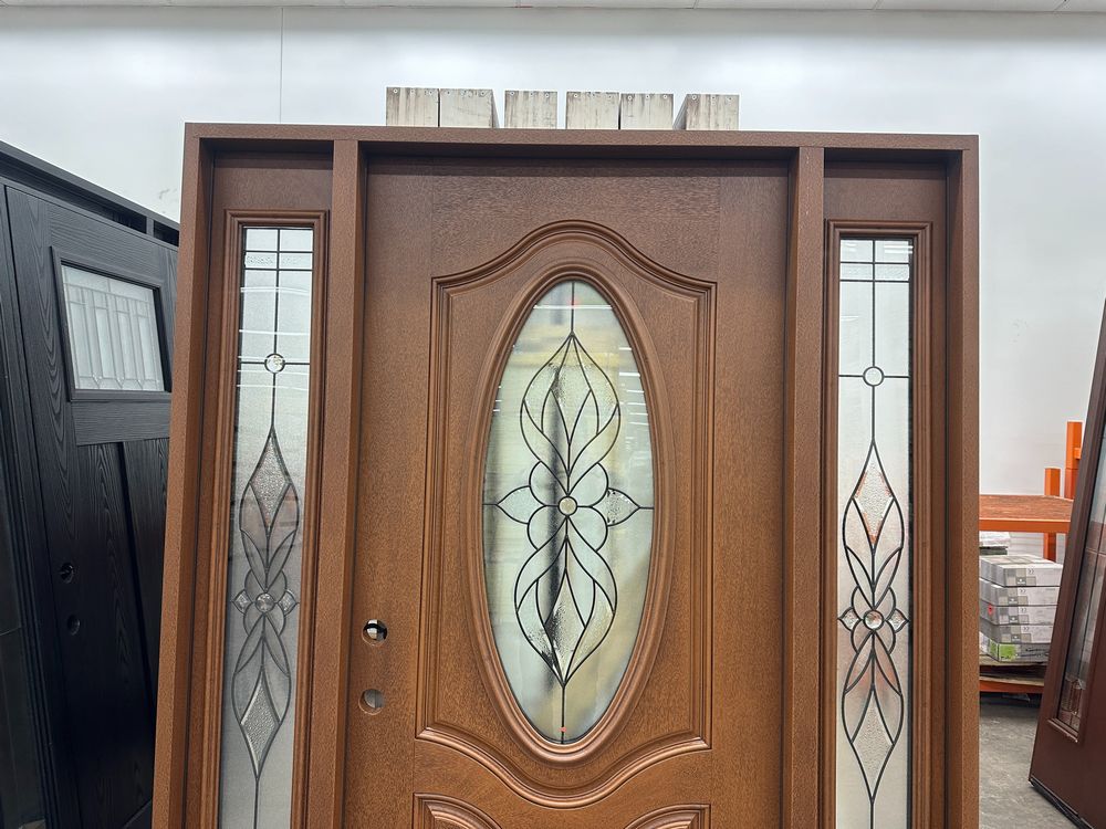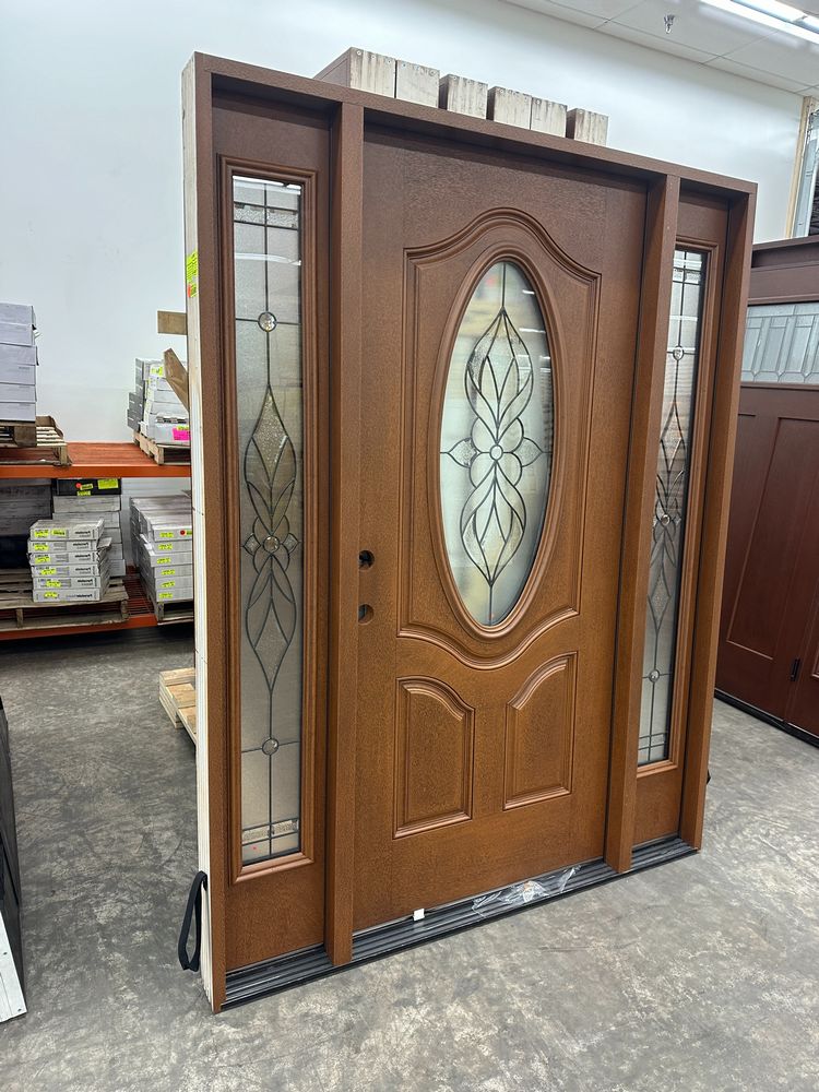 Exterior Fiberglass Deco Door With 2 Side Lites 63 1/2"x81 1/2" RH. Stained Finish, 2-12" Side Lites, 36" Decorative Door, 3/4"x4 1/2" Jambs, 14 1/2"x24 1/2" Glass, Red & Black Patina Pattern, Grade: A. Weight: 180. Sold by: Door. Sold as: Price X Quantity. Inventory #: 5210-EXT FG R&BP STND 1-3-1