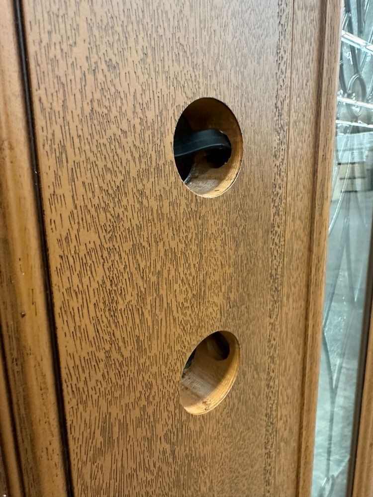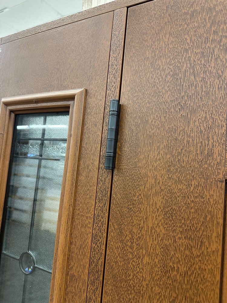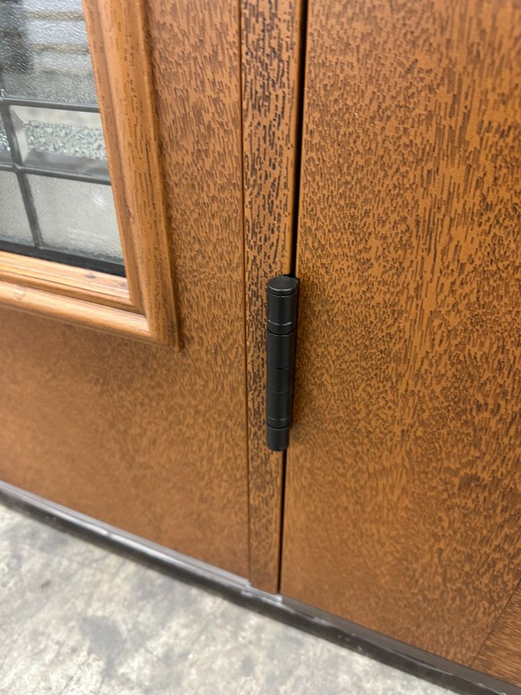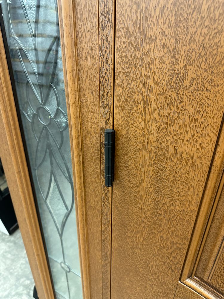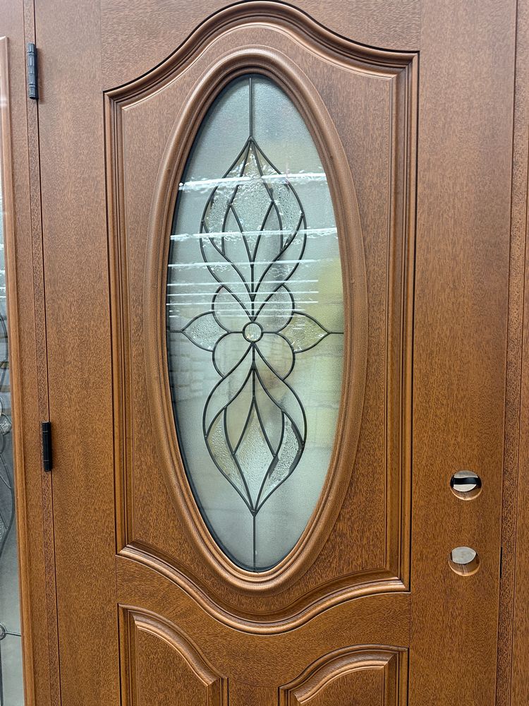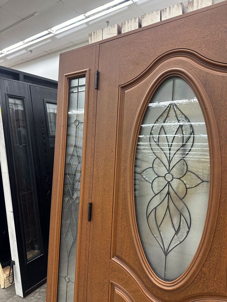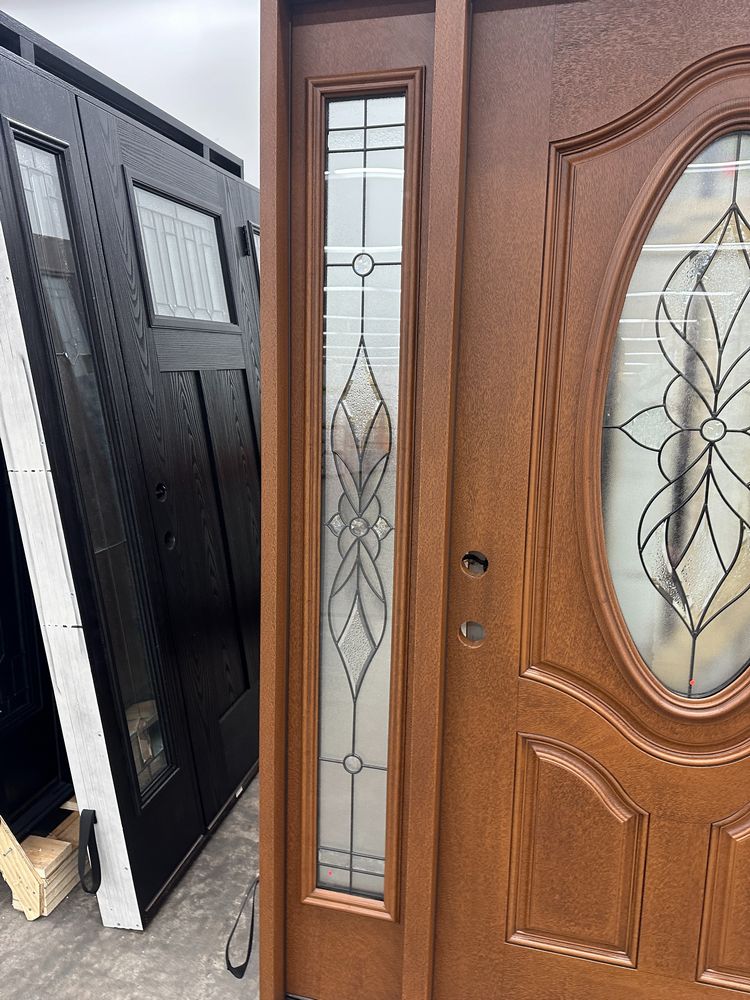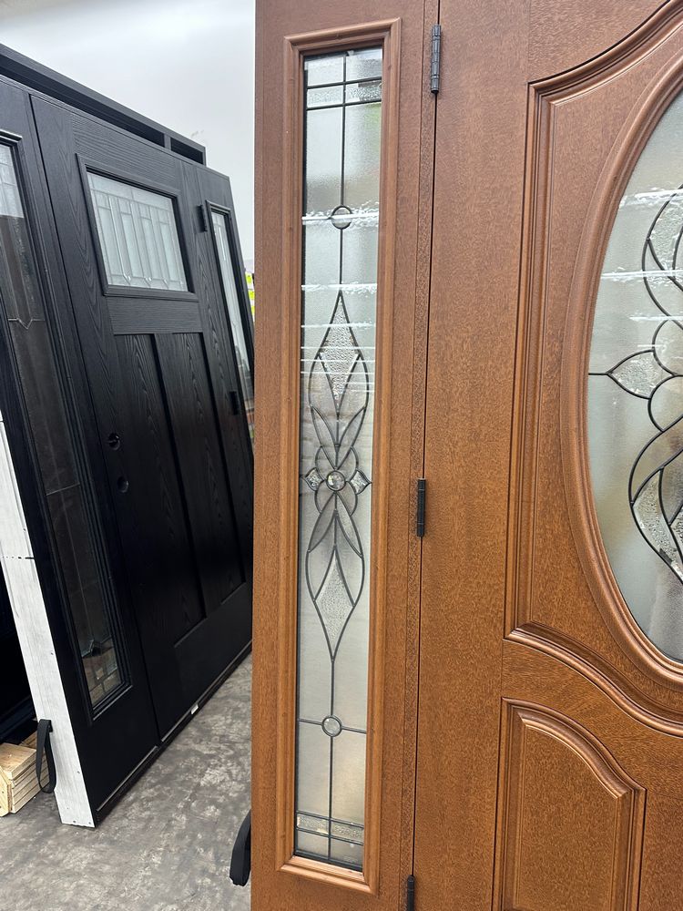Exterior Fiberglass Deco Door With 2 Side Lites 63 1/2"x81 1/2" RH. Stained Finish, 2-12" Side Lites, 36" Decorative Door, 3/4"x4 1/2" Jambs, 14 1/2"x24 1/2" Glass, Red & Black Patina Pattern, Grade: A. Weight: 180. Sold by: Door. Sold as: Price X Quantity. Inventory #: 5210-EXT FG R&BP STND 1-3-1