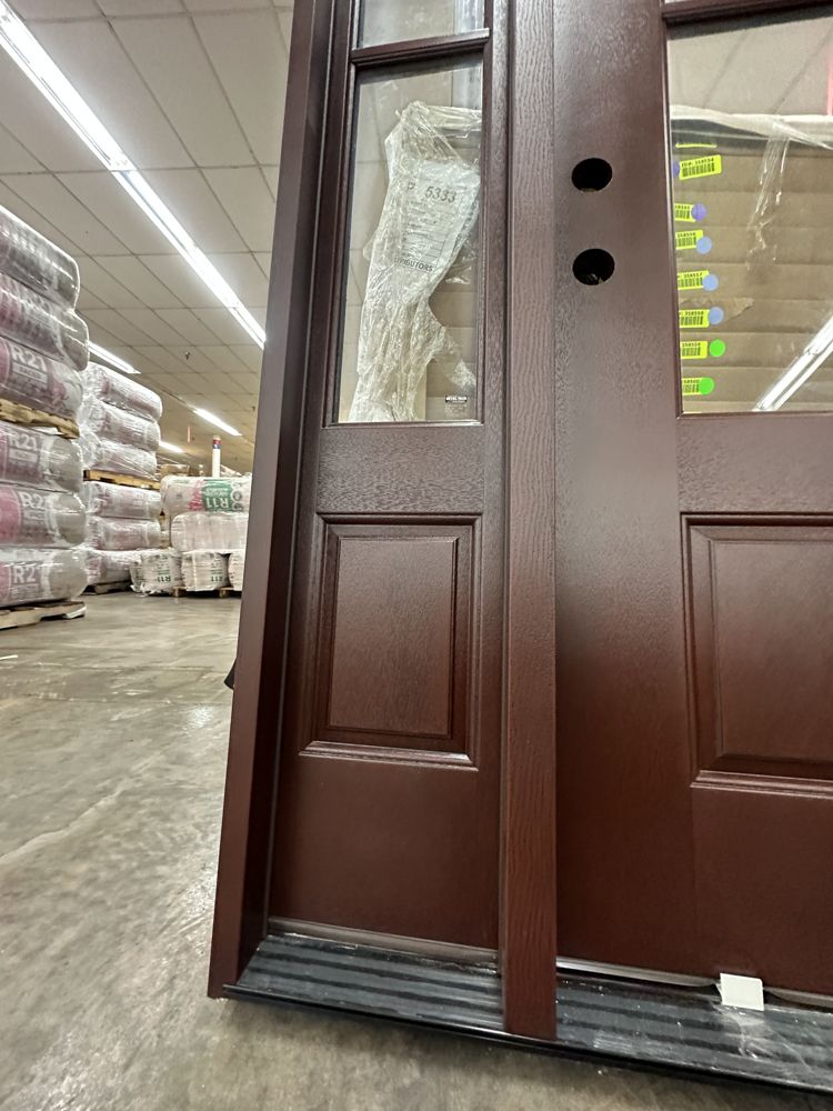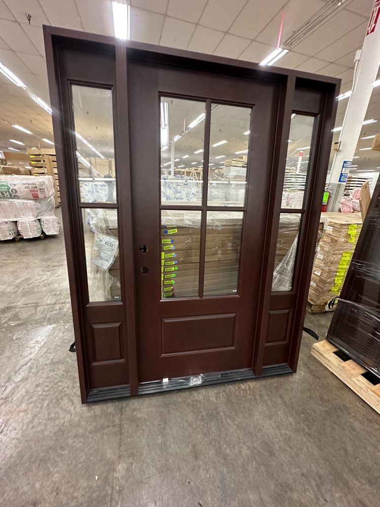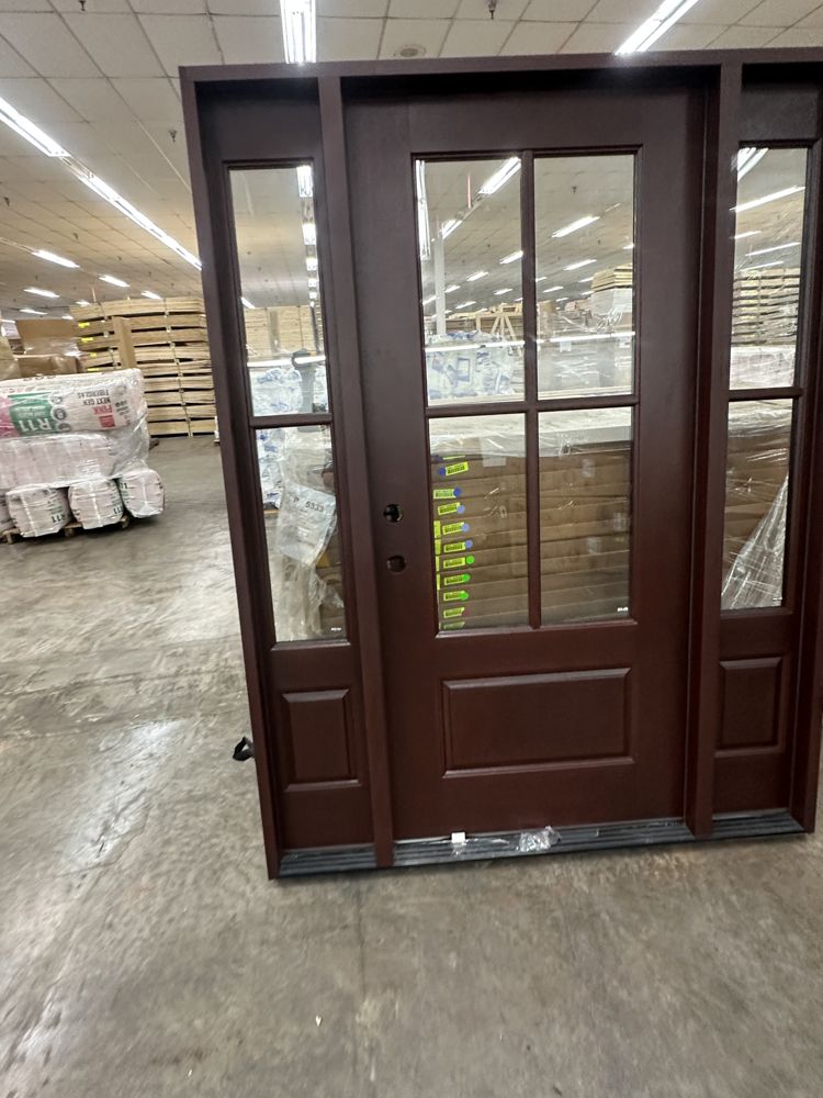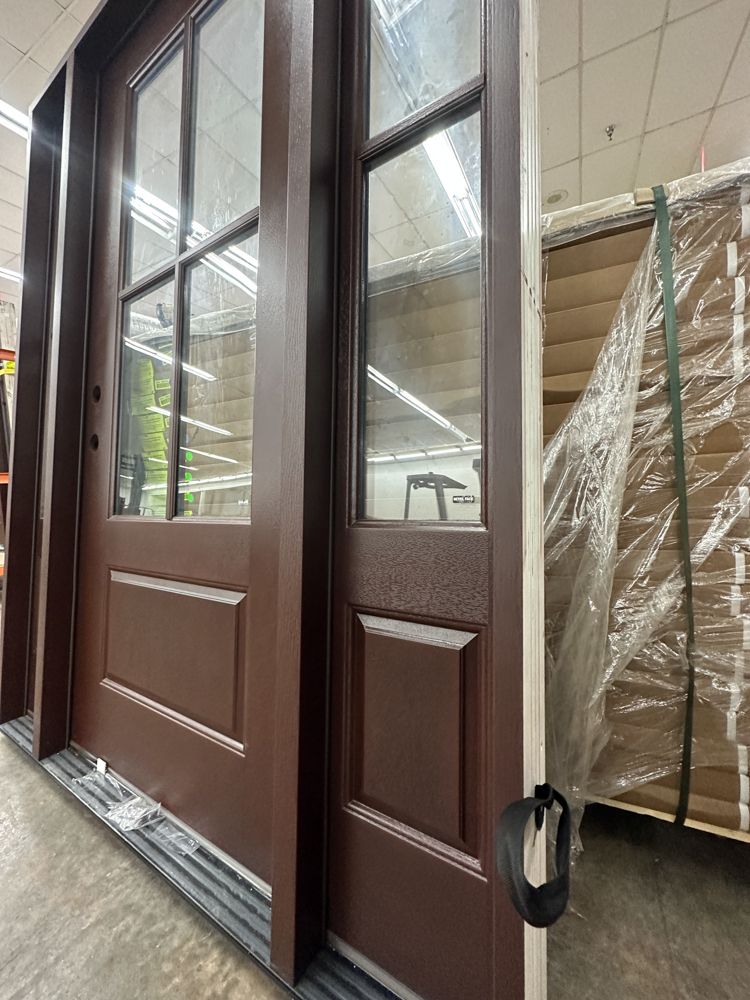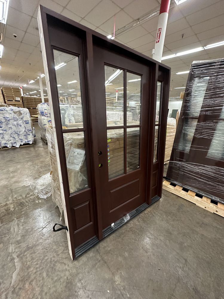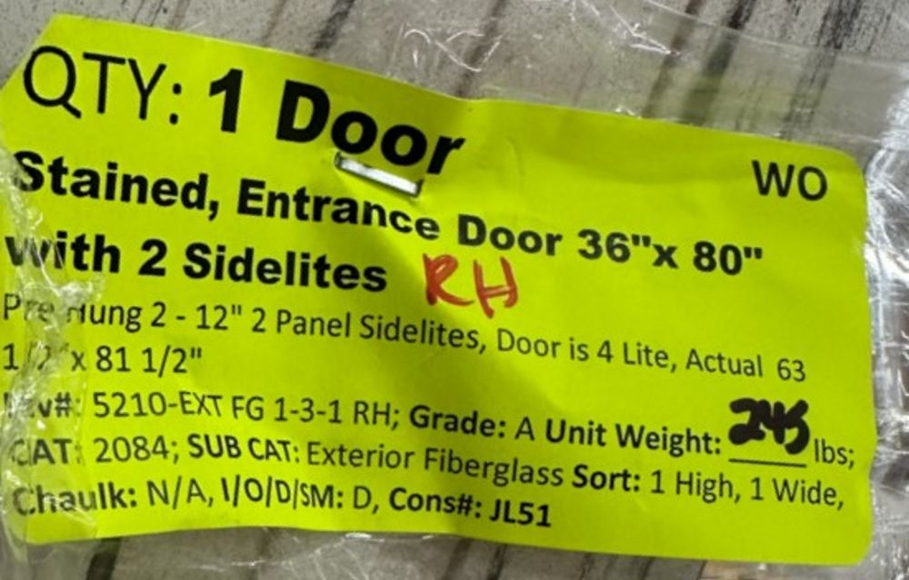 Stained, Entrance Door 36"x80" With 2 Sidelites, RH. Pre-Hung 2-12" 2-Panel Sidelites, Door is 4 Lite, Actual Dimensions 63 1/2"x81 1/2", Grade: A. Weight: 245. Sold by: Door. Sold as: Price X Quantity. Inventory #: 5210-EXT FG 1-3-1 RH