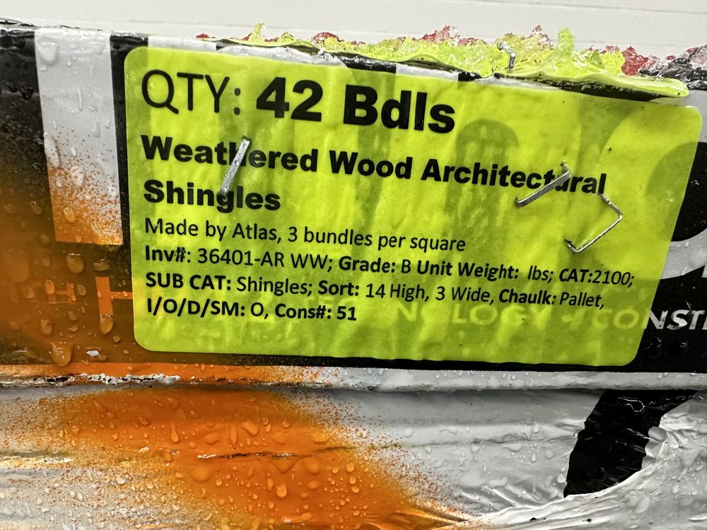 Weathered Wood Architectural Shingles. Made By Atlas, 3 Bundles Per Square, Grade: B. Weight: x. Sold by: Bundle . Sold as: Price X Quantity. Inventory #: 36401-AR WW