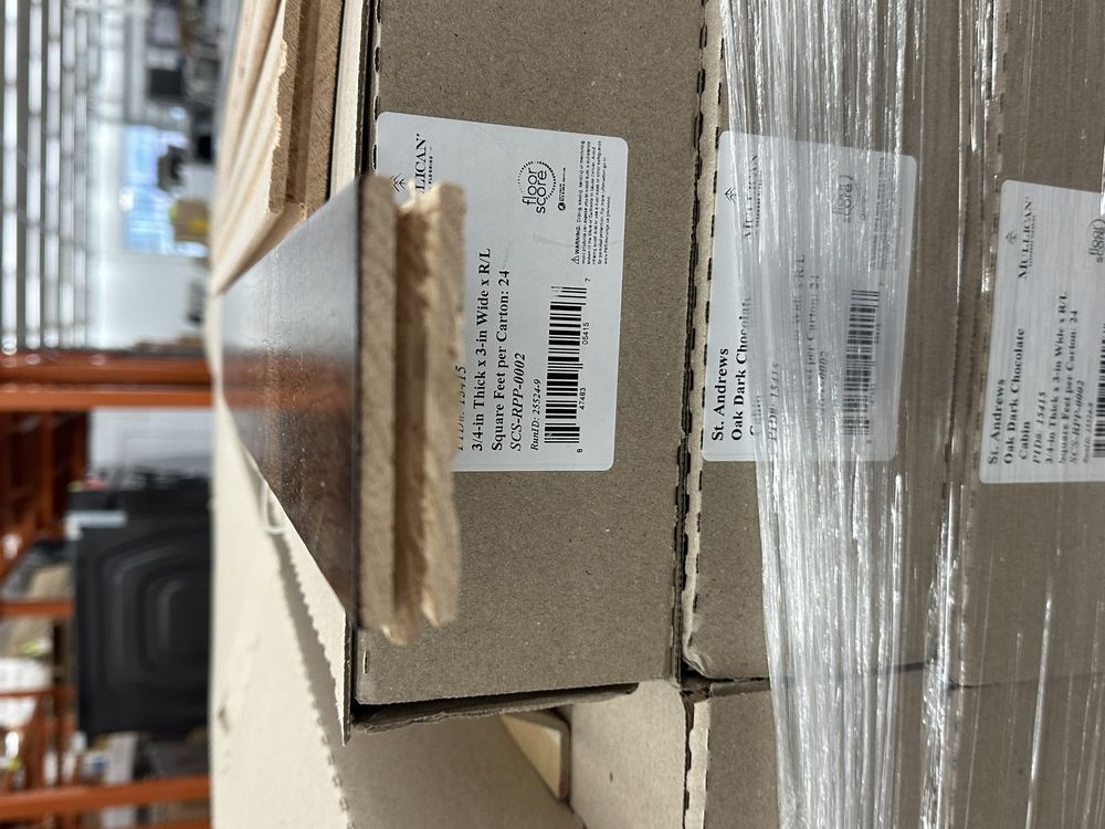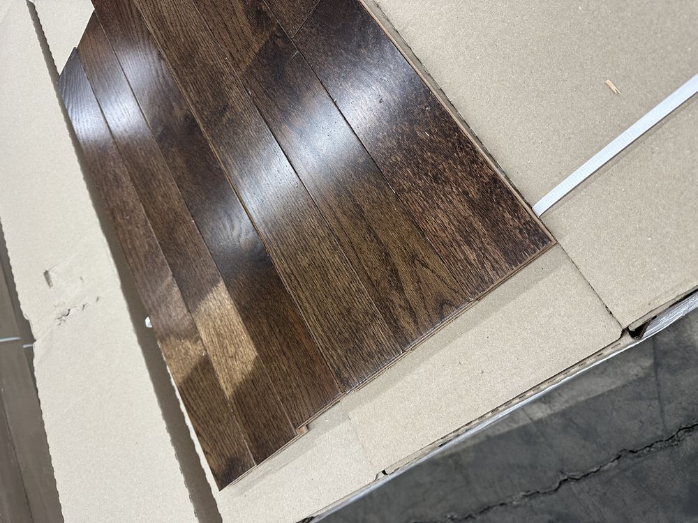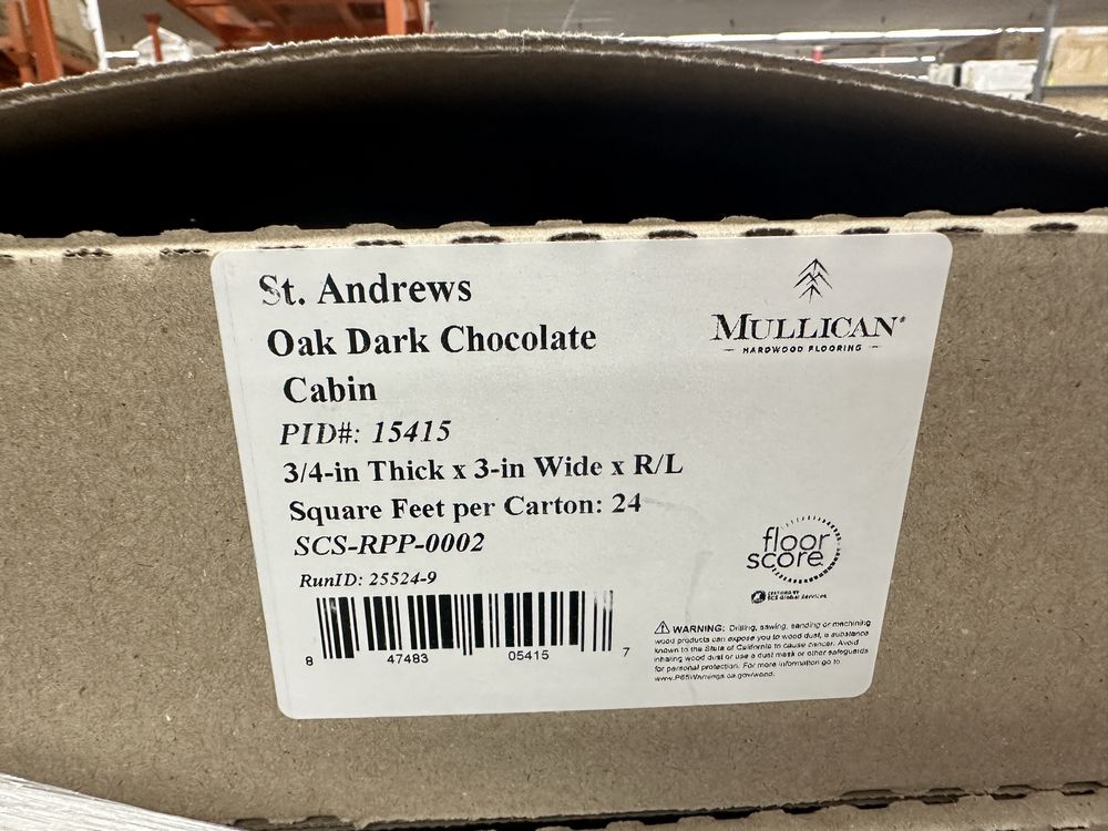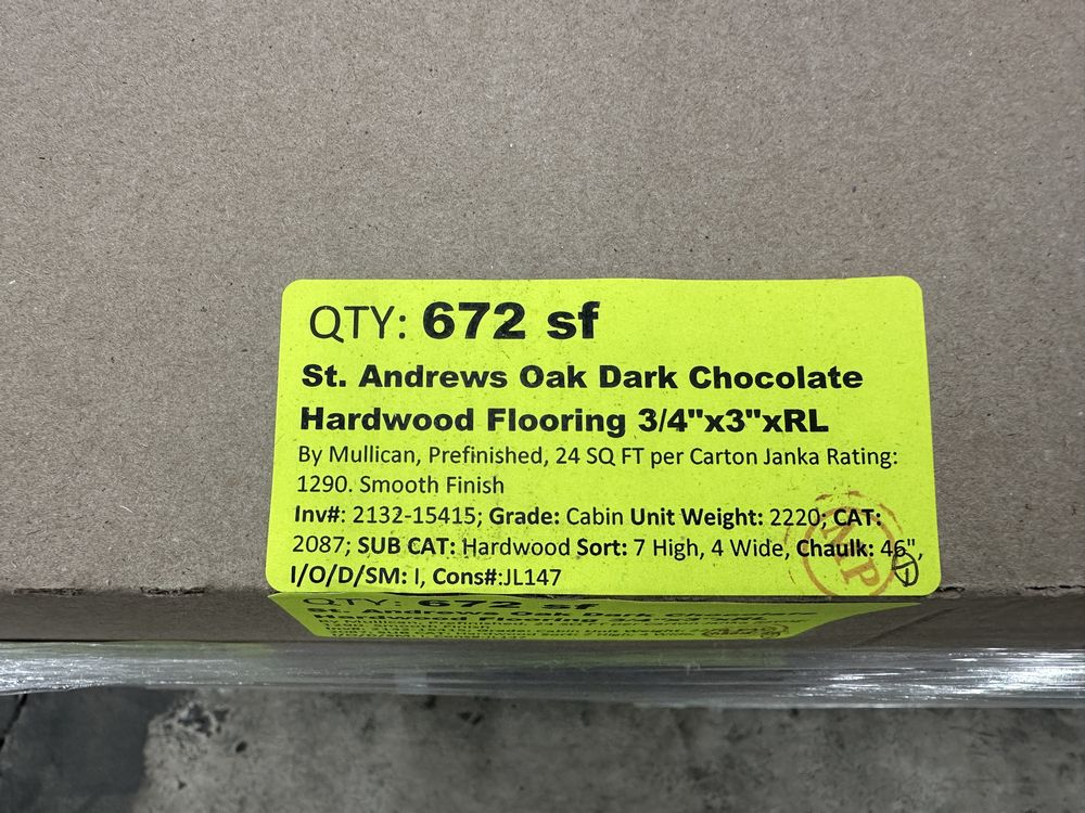 St. Andrews Oak Dark Chocolate Hardwood Flooring 3/4"x3"xRL. By Mullican, Prefinished, 24 SQ FT Per Carton, 28 Cartons, Janka Rating: 1290, Smooth Finish, Grade: Cabin/Utility/Tavern Grade: This flooring product will have varying wood characteristics and colors to include streaks, deeper knots and burls, small splits, wormholes, and even marks during the milling process such as machine burns. It may also have a large variance in color and grain patterns. The boards are typically 10” to 30” with an average board length of 16”. It is usually packaged in mini bundles of 18-20 sf per bundle. It is ok for 5” wide to be heavier in shorter pieces. Cabin grade is a stable, installable product but please account up to 10%-20% waste. Weight: 2220. Sold by: Square Foot. Sold as: Price X Quantity. Inventory #: 2132-15415