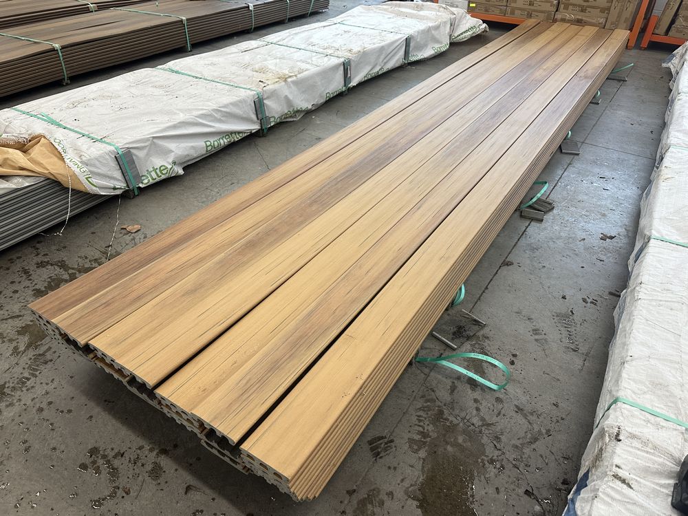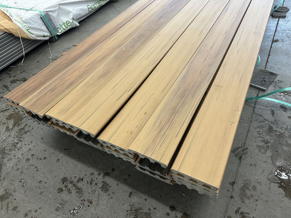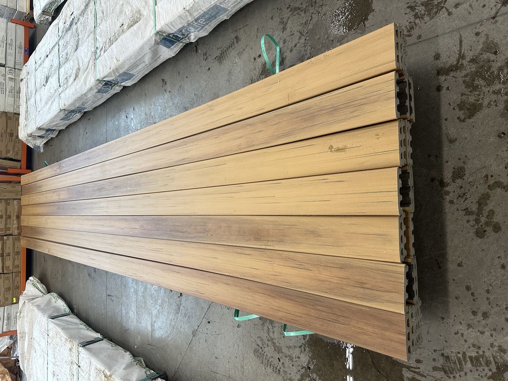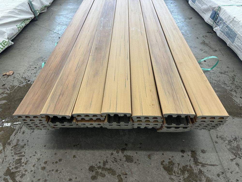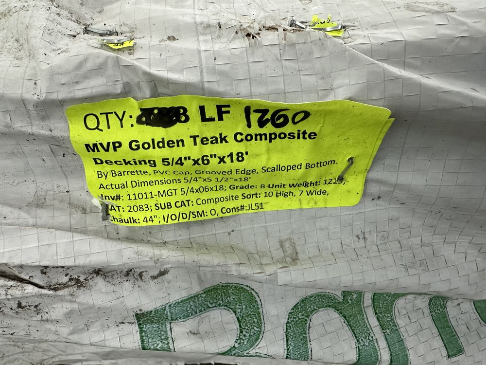 MVP Golden Teak Composite Decking 5/4"x6"x18'. By Barrette, PVC Cap, 70 Boards Total, Grooved Edge, Scalloped Bottom, Actual Dimensions 5/4"x5 1/2"x18', Grade: B. Weight: 1229. Sold by: Linear Foot. Sold as: Price X Quantity. Inventory #: 11011-MGT 5/4x06x18